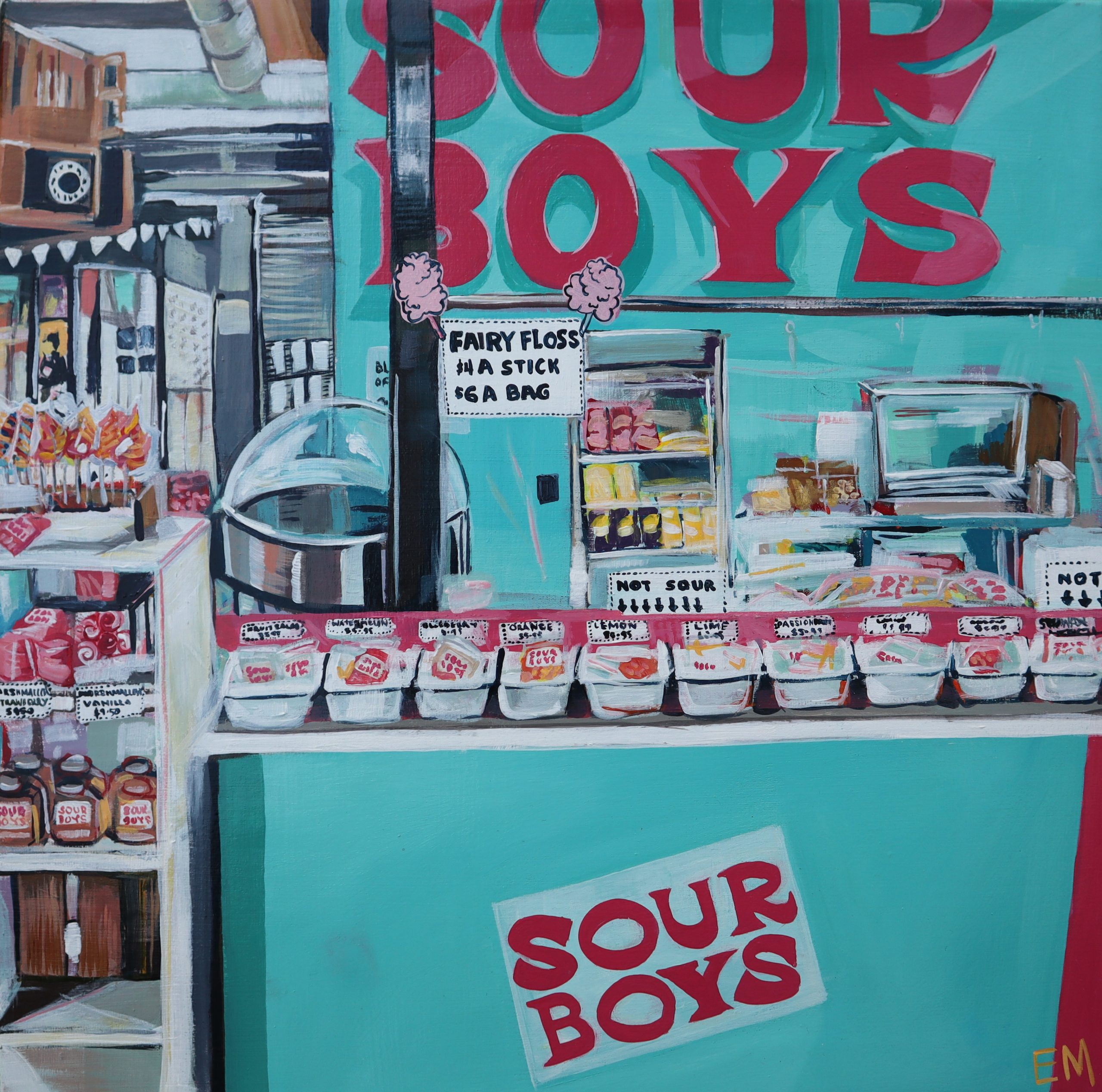 “The Candy Shop” by Elisha McGuckin is a playful painting from her “All Consumed” Collection