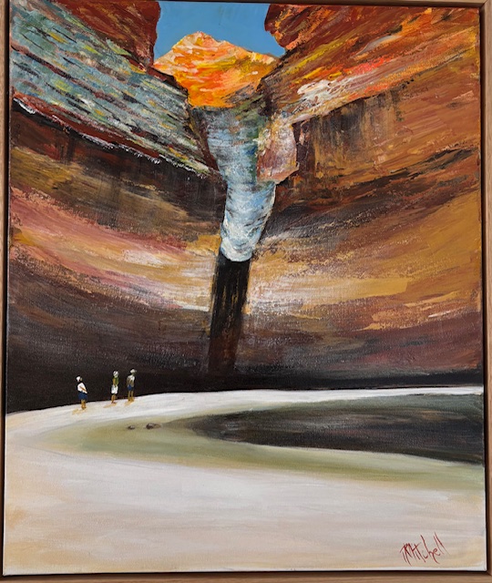 My inspiration for this painting was on a trip to the Kimberley area and walking through those massive rocks I arrived at this amazing destination. They call it The Cathedral. While I was standing in awe of these gigantic rock formations with the sun glinting off the top in a golden hue, a woman came into the area and started to sing. She had a beautiful voice and the whole cavity reverberated with this wonderful voice. It felt like we were in a cathedral. It was very moving and I had goosebumps, so I just had to recreate that feeling as best as I could on canvas.