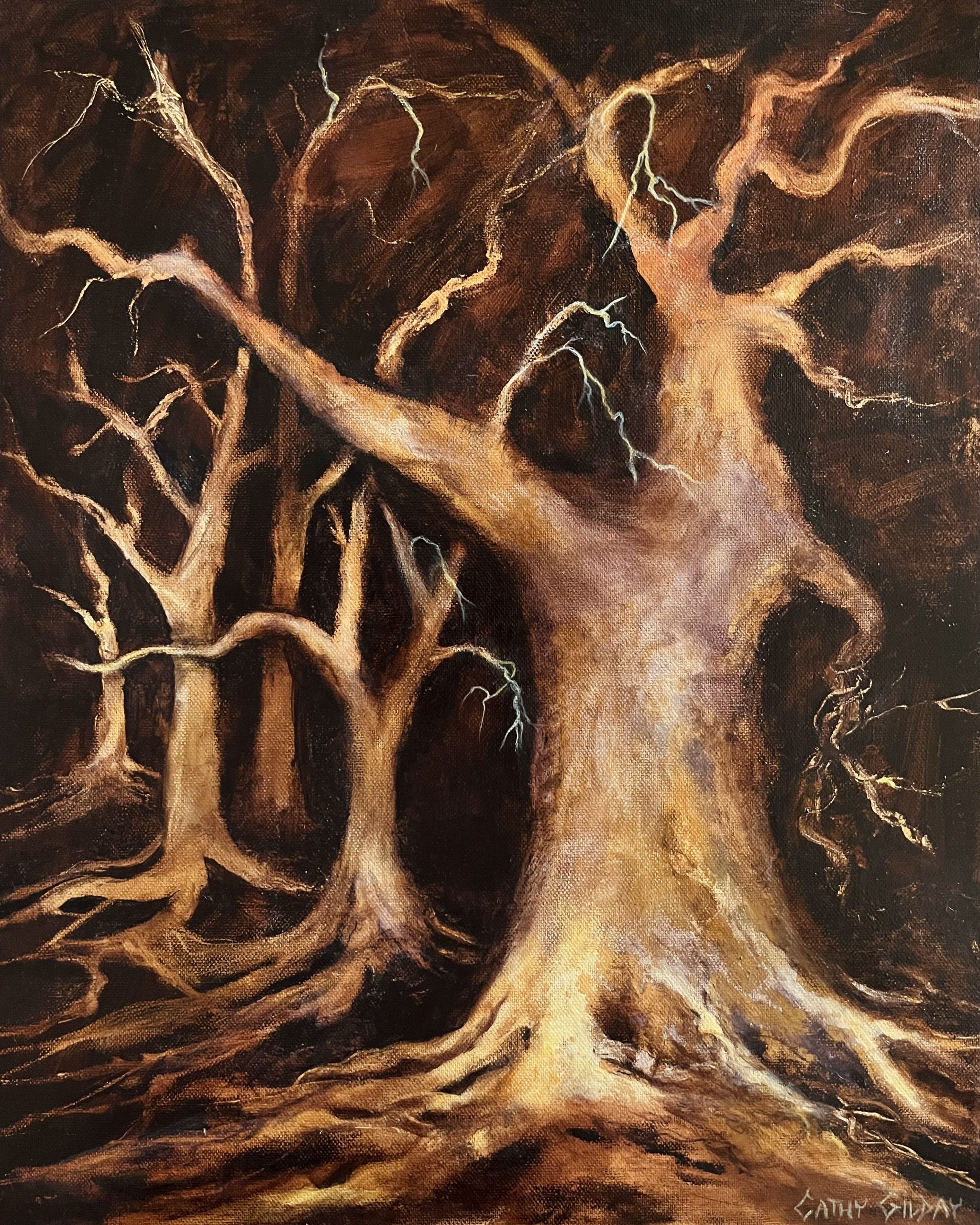 I titled this painting, ‘The Chorus Line’ because the trees reminded me of dancers, lined up on a spotlit stage and I thought that their twisted branches and roots, mimic the actions of performers. I used a limited palette, concentrating on the interplay of warm light and shadows. A perfect painting for nature lovers, to bring the outdoors inside.