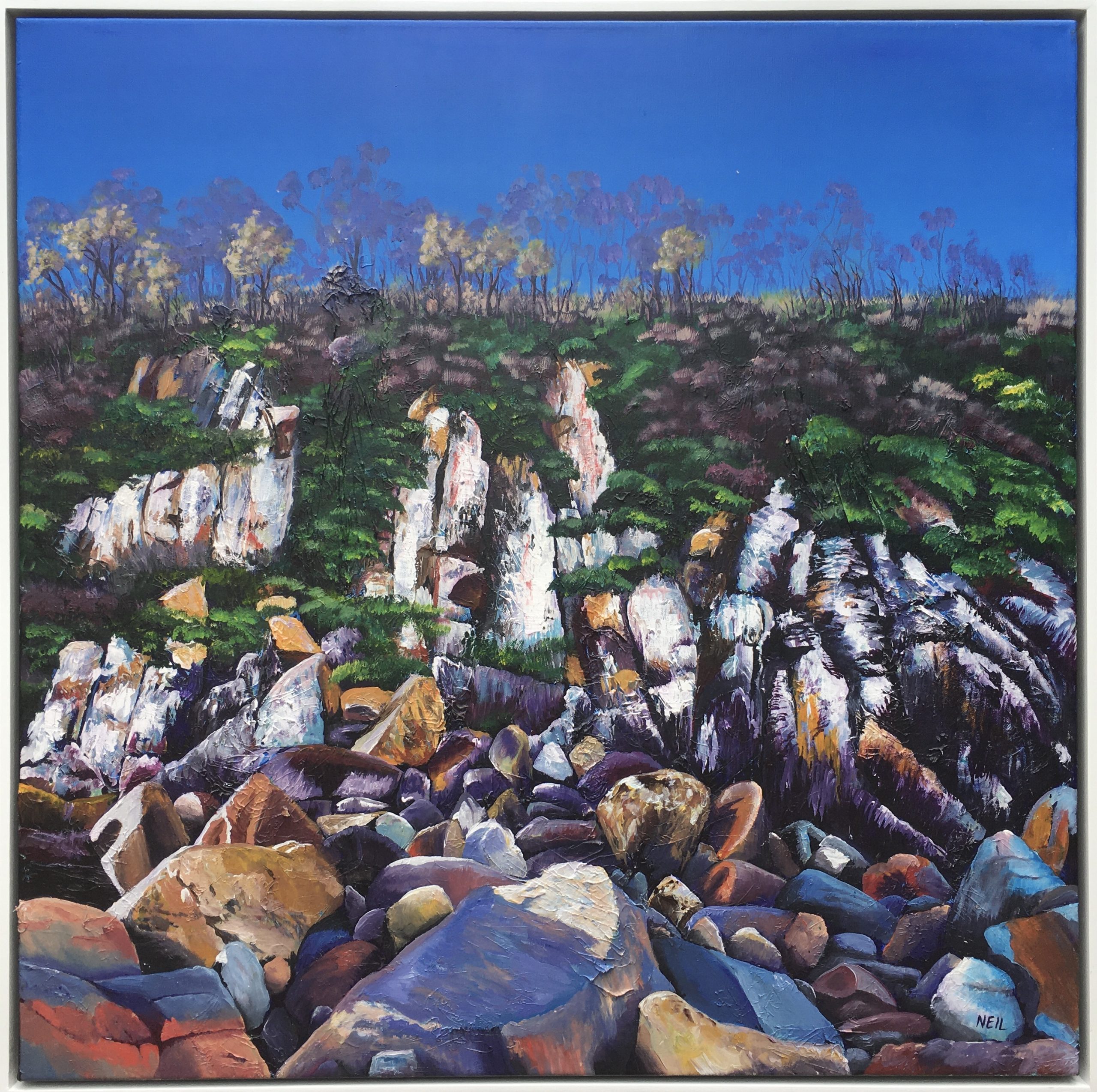 Acrylic Paint on stretched canvas, ready to hang, framed in Tasmanian oak painted white (lovingly made by me) frame.