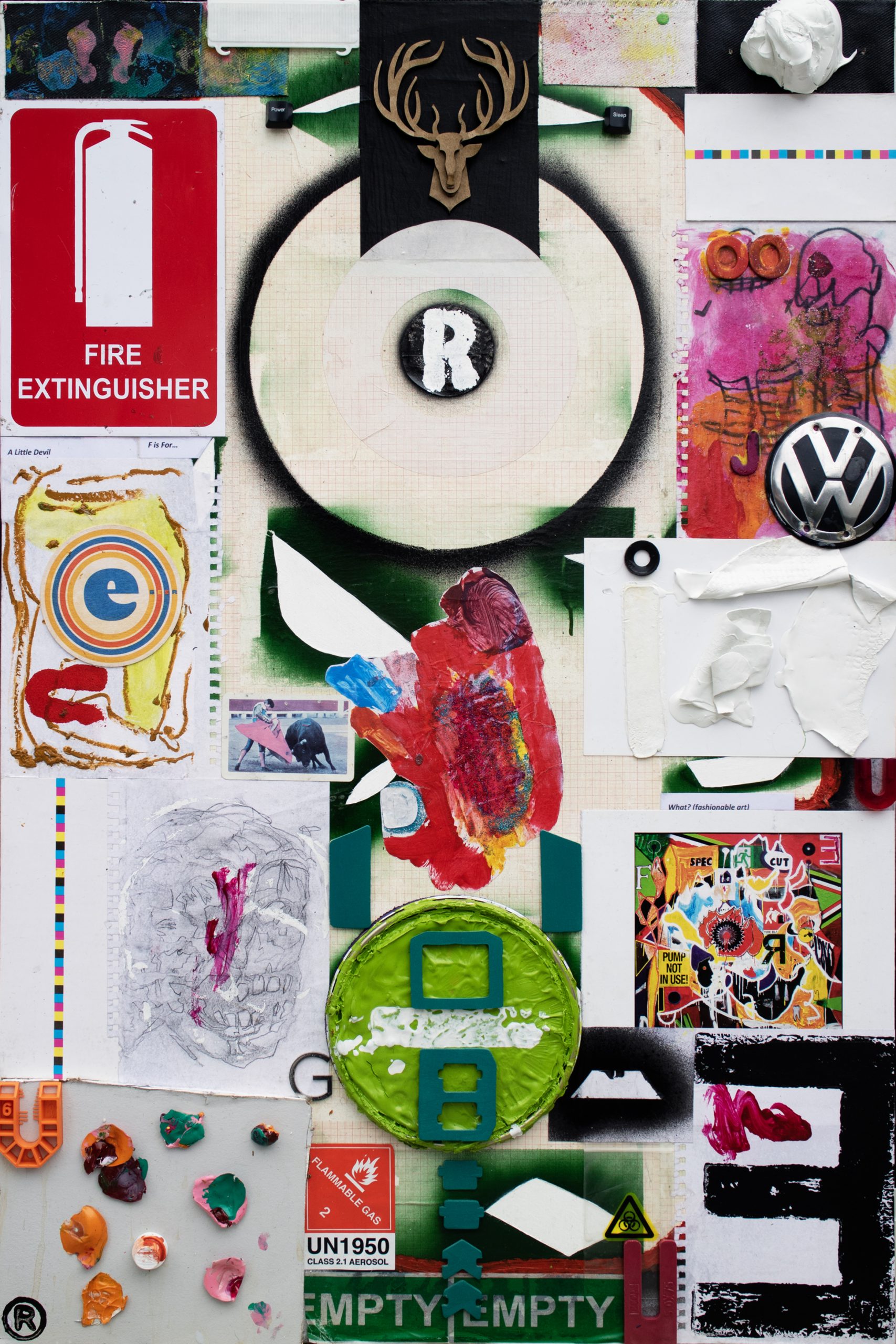 The Collector by Rehgan De Mather Mixed media – acrylic, spray paint, oil stick, paint skins, paint tin lid, plaster and collage on marine ply.