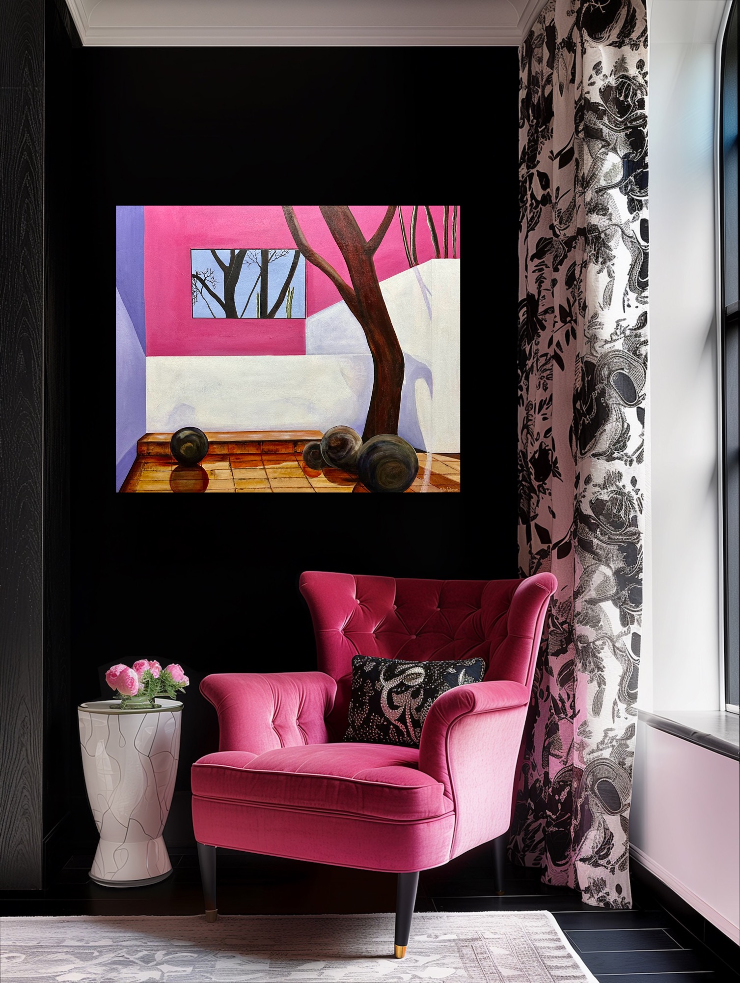 Gilardi House is situated in Mexico City and this beautiful home and courtyard was designed by internationally acclaimed architect Luis Barragan. I am intrigued by the symmetry and colours and play on shadows. The magenta pink and purple concrete walls offset by the stark white and then the natural stone. The sculpture of the stone balls mixed with steel to stop them from moving. The entire courtyard is entrancing.