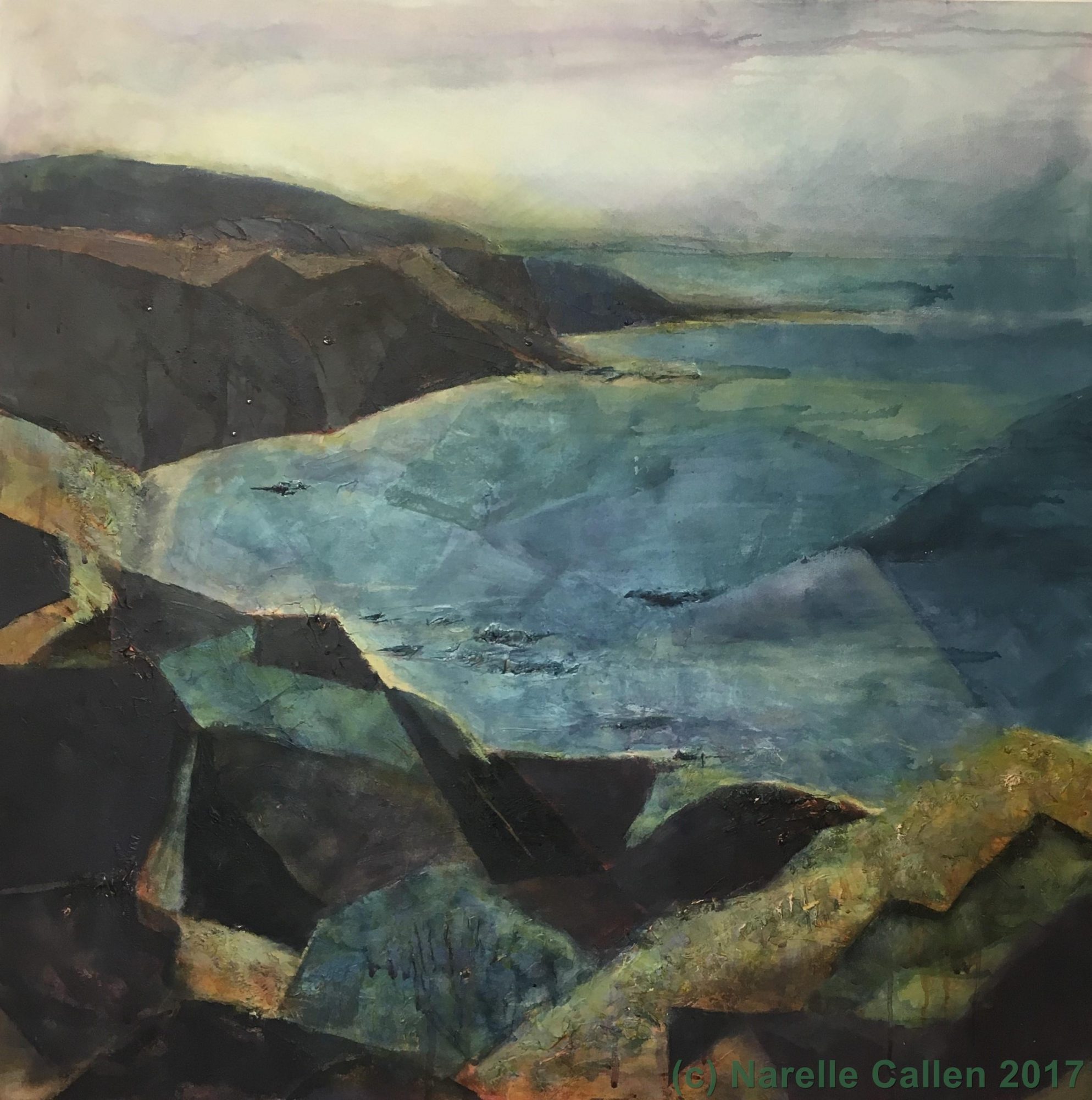 Inspired by the sea views of the southern coastline of Victoria – the Great Ocean Road.  The view out to sea is endless and every now an then you come around a bend in the road above and look down to a secret cove at the foot of a cliff.The Cove is an original abstract seascape painting inspired by travels along the southern coastline of Victoria – the Great Ocean Road.  Painted in acrylic on canvas, the ground has been prepared with gesso and the texture is achieved using impasto and paper. Layers of colour and transparent washes build up the under colours of the sea and the cliffs to achieve a subtle turquoise ocean blue which reflects the pink in the sky above. The artwork is sealed in a satin varnish and can be wiped clean with a damp clean cloth. The painting is unframed, however as the sides are painted and it is complete with a hanging wire and taped to neaten the canvas edges on the back it is ready to hang. It has bumper pads on the lower corners to protect your walls.