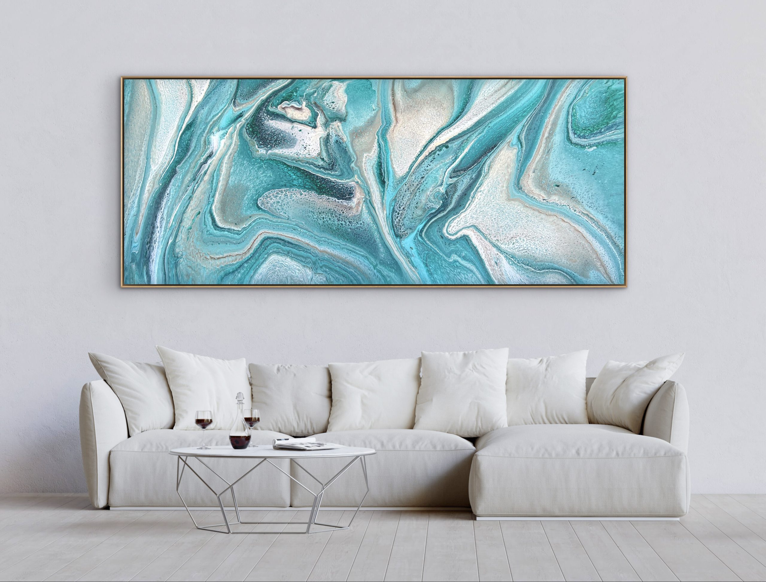 This gorgeous piece is 240cm x 100cm and features aqua, teal, turquoise, umber, phalto green, cream/grey and white acrylics. I will sign the bottom left corner once the orientation is confirmed just in case you’d like it hung a different way.