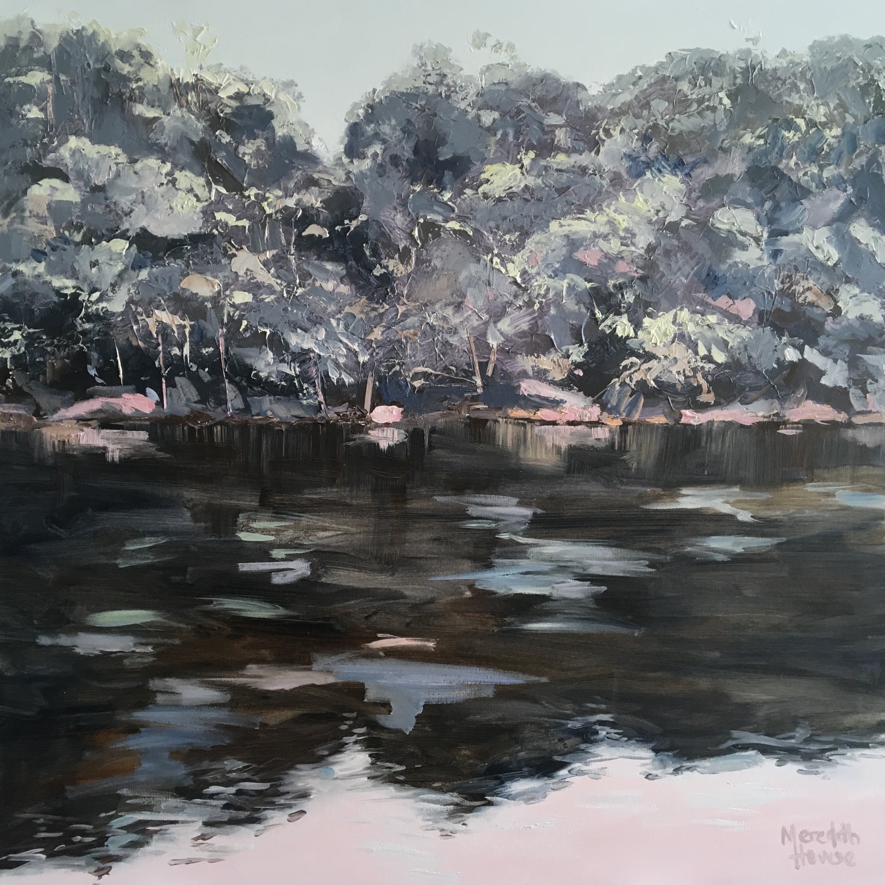 The Daintree is a sublime romantic artwork influenced by the achingly beautiful Daintree River in Northern Queensland, Australia. It has textured oil paint on canvas, with translucent areas of paint in the water given the feel of reflective and moving water.
