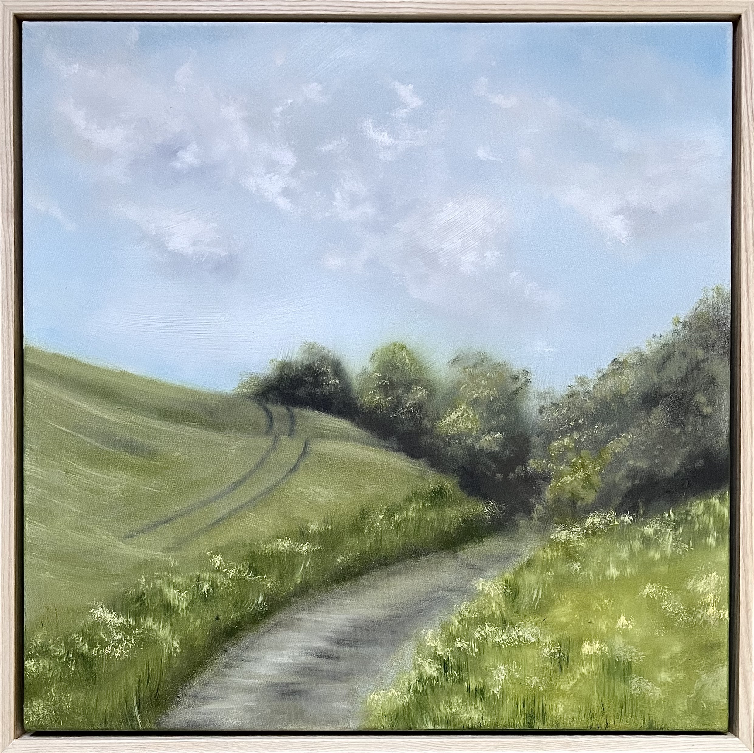 Ready to hang, original oil painting on stretched canvas with American ash floating frame.