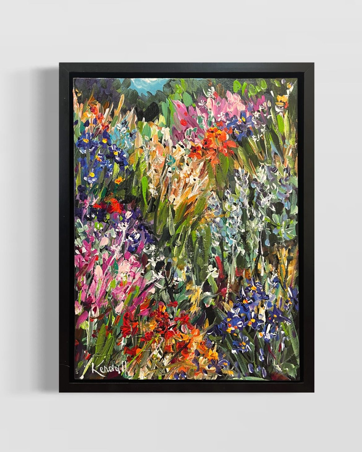 The Dance by Kendall Perkins – piece is the second half of a two piece series that were inspired by the beautiful blooms of Toowoomba in September. Toowoomba is where I grew up, and my favourite flower patches in the parks around Toowoomba are the ones showcasing a vibrant motley of flowers and colours all mixed together.