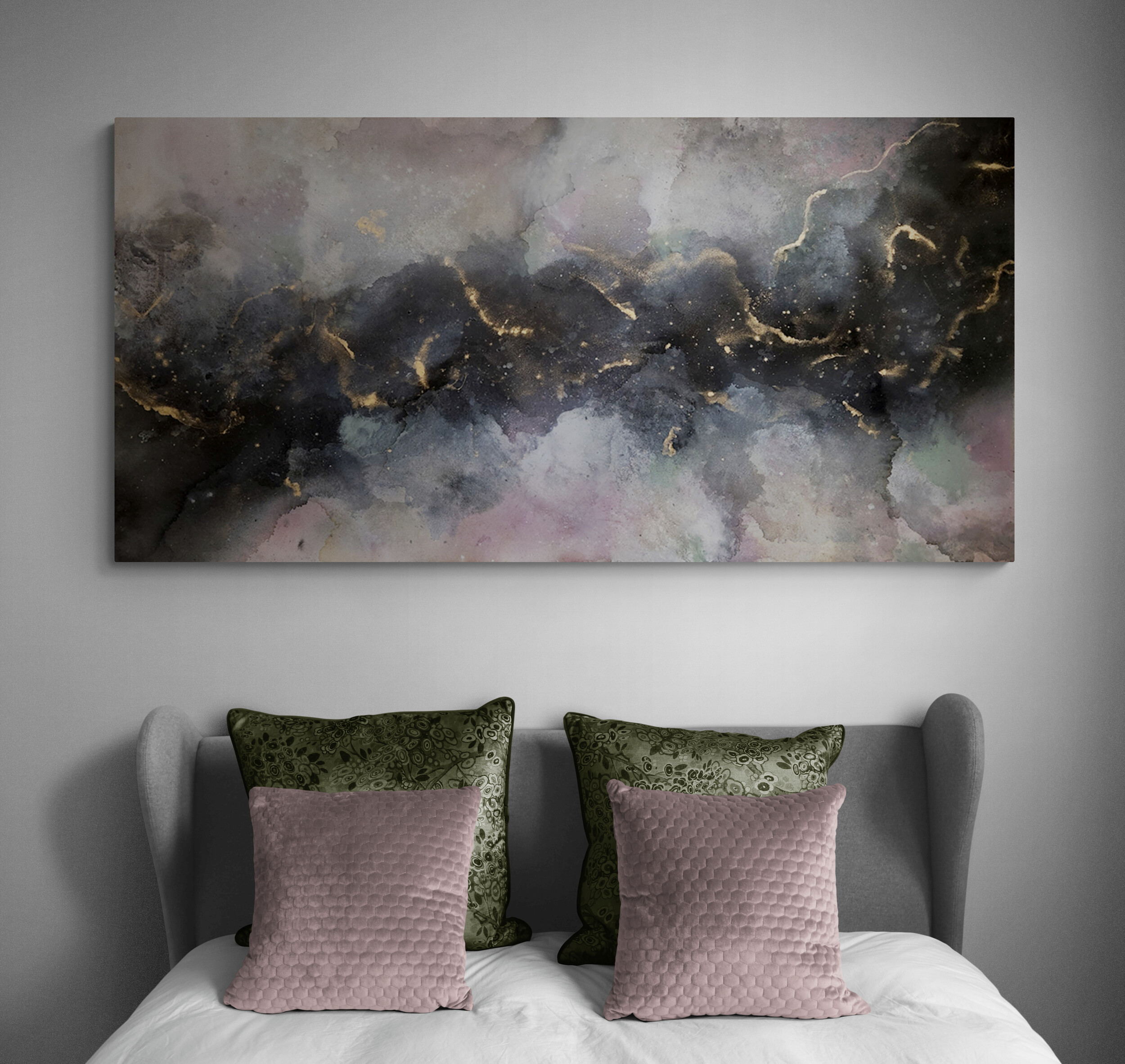 The artwork is moody and dramatic, with colours of black, metallic gold, blush pink, grey, sage greens and charcoal. If you’re a lover of gold this piece is for you!