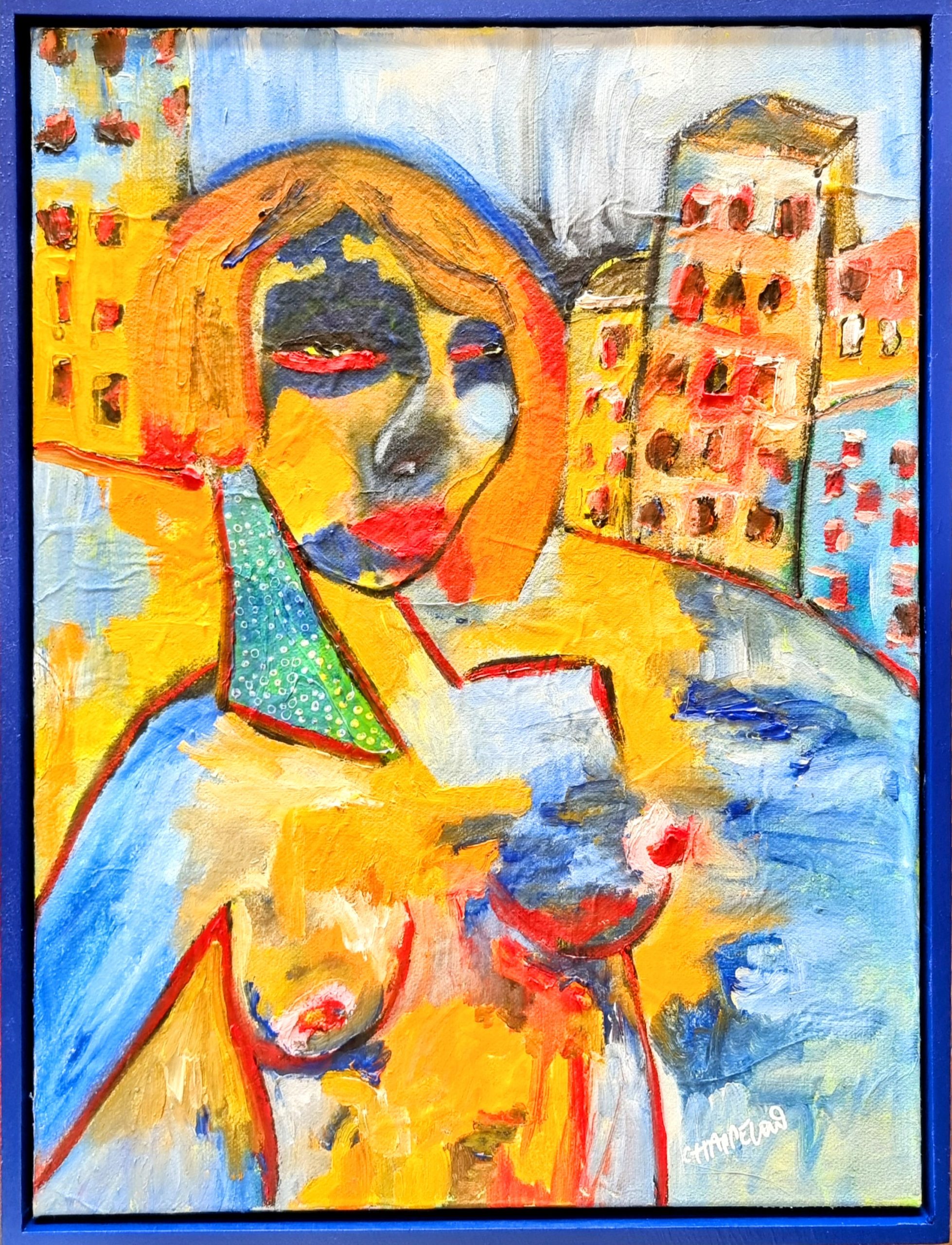 A highly textured acrylic, ink and oil painting on Japanese Rice Paper on stretched canvas and framed in rustic blue frame.