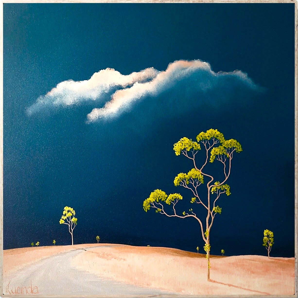 “The Dry Road” captures a moment of stillness in a vast, sunbaked landscape where the simplicity of form reveals a quiet strength. A soft grey road curves gently through pale ochre earth, leading the eye toward the horizon under a deep, dark blue sky. The lone trees, delicate yet resilient, stand with sparse canopies of vivid green, offering a hint of life against the muted tones of the land. Above them, a single band of pale clouds drifts slowly, their edges kissed by light, as if the world holds its breath between day and dusk.