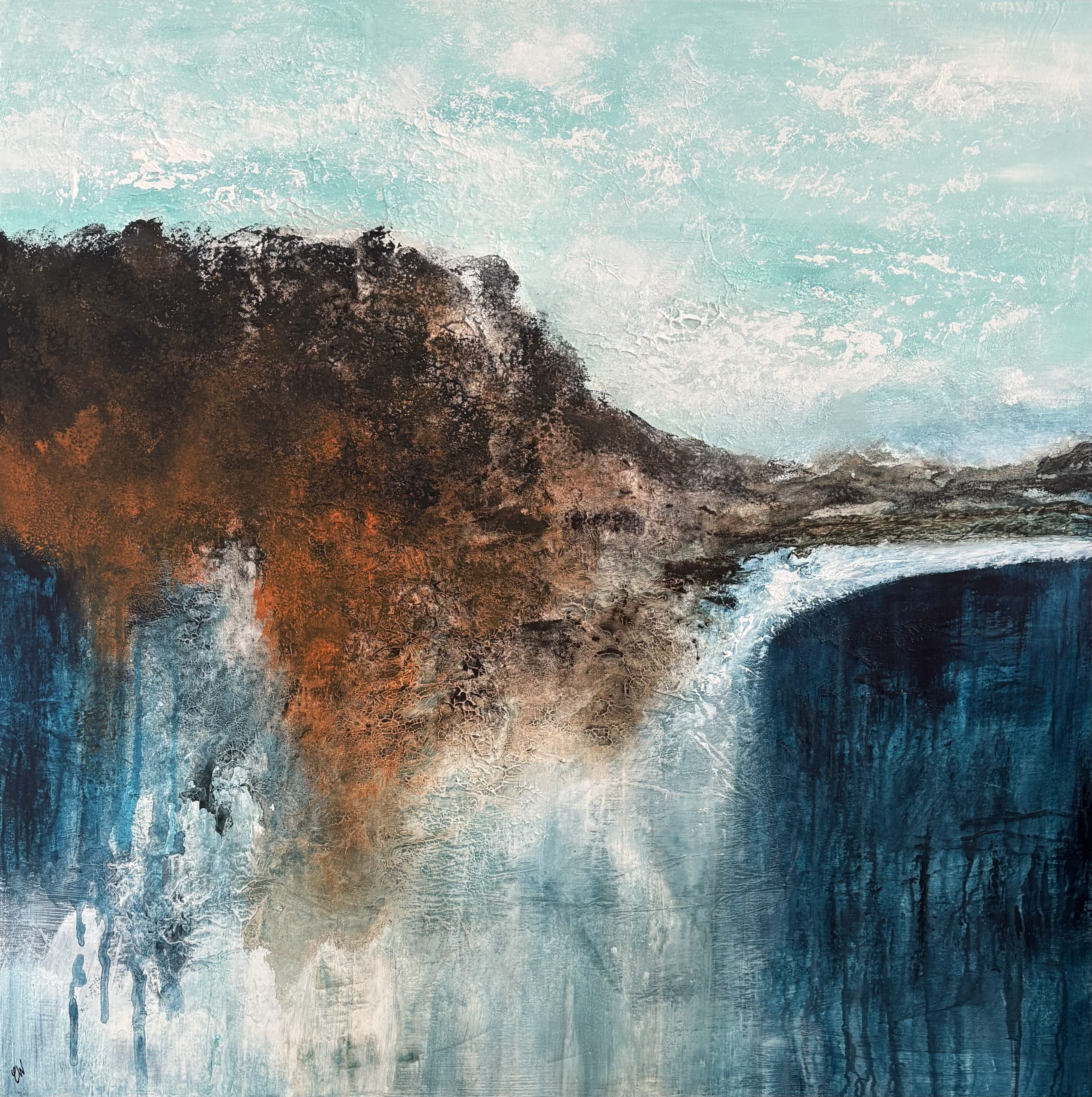 The Edge by Carrie Welsh is a beautifully textured abstract landscape/seascape. 91.4 x 91.4 x 2 cm. Acrylic on canvas, ready to hang. Frame not included.