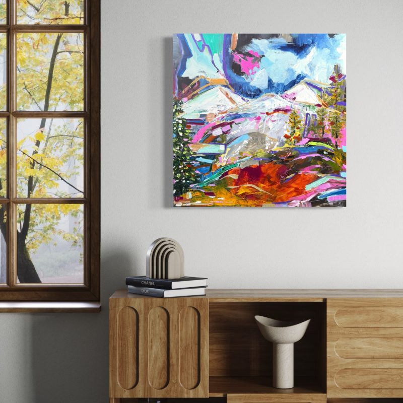 The Emission by Cathy Gilday – Recent eruptions of both Mount Etna and Stomboli are the inspiration for this abstract of molten rock and bubbling lava. This is a large painting, with a vibrant and powerful presence. Sides painted, sealed.
