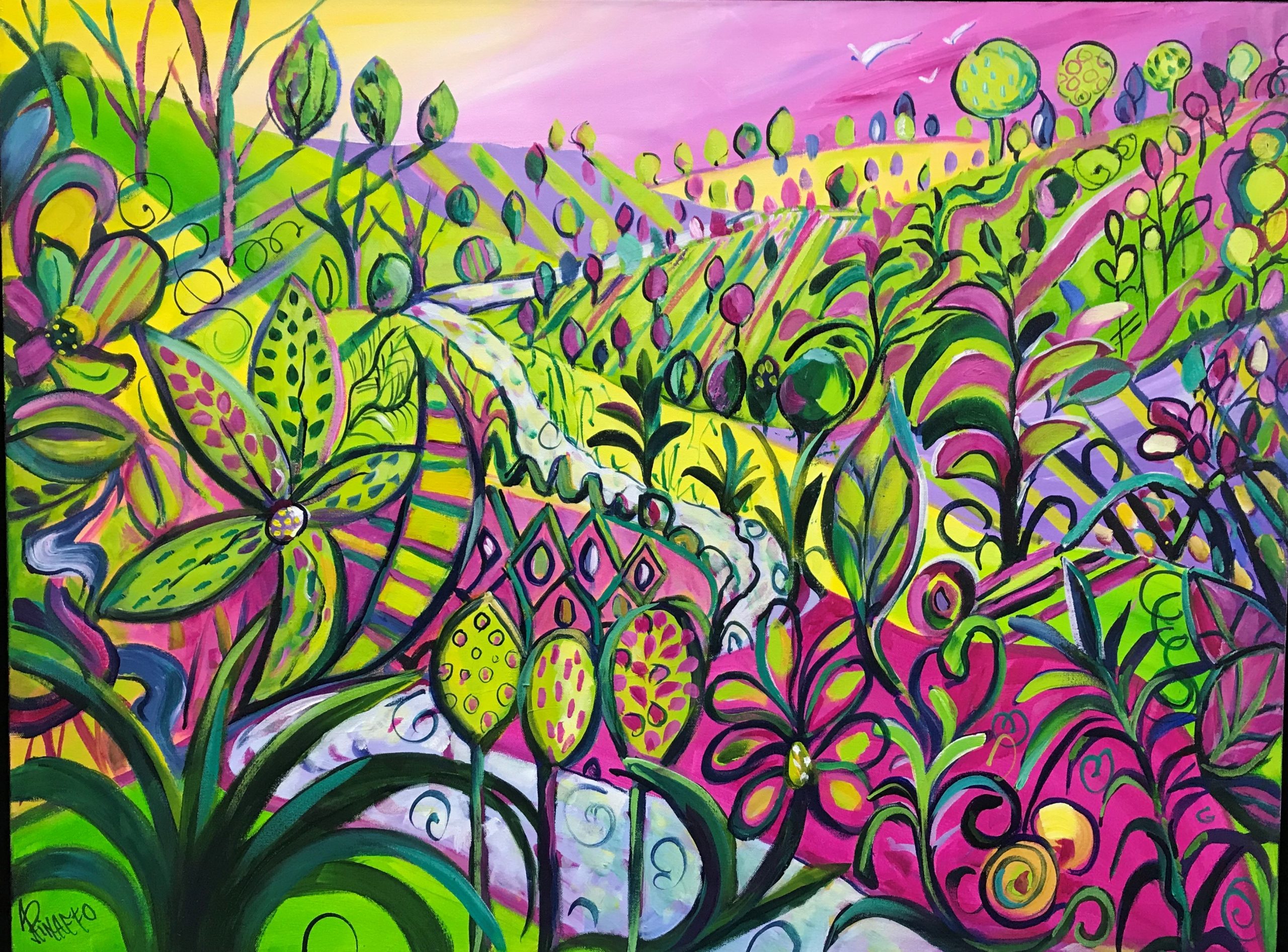 A white canvas and lots of beautiful colors on my palette helped me create this painting. It evolved as I worked, the ideas come up slowly exclusively from my imagination.