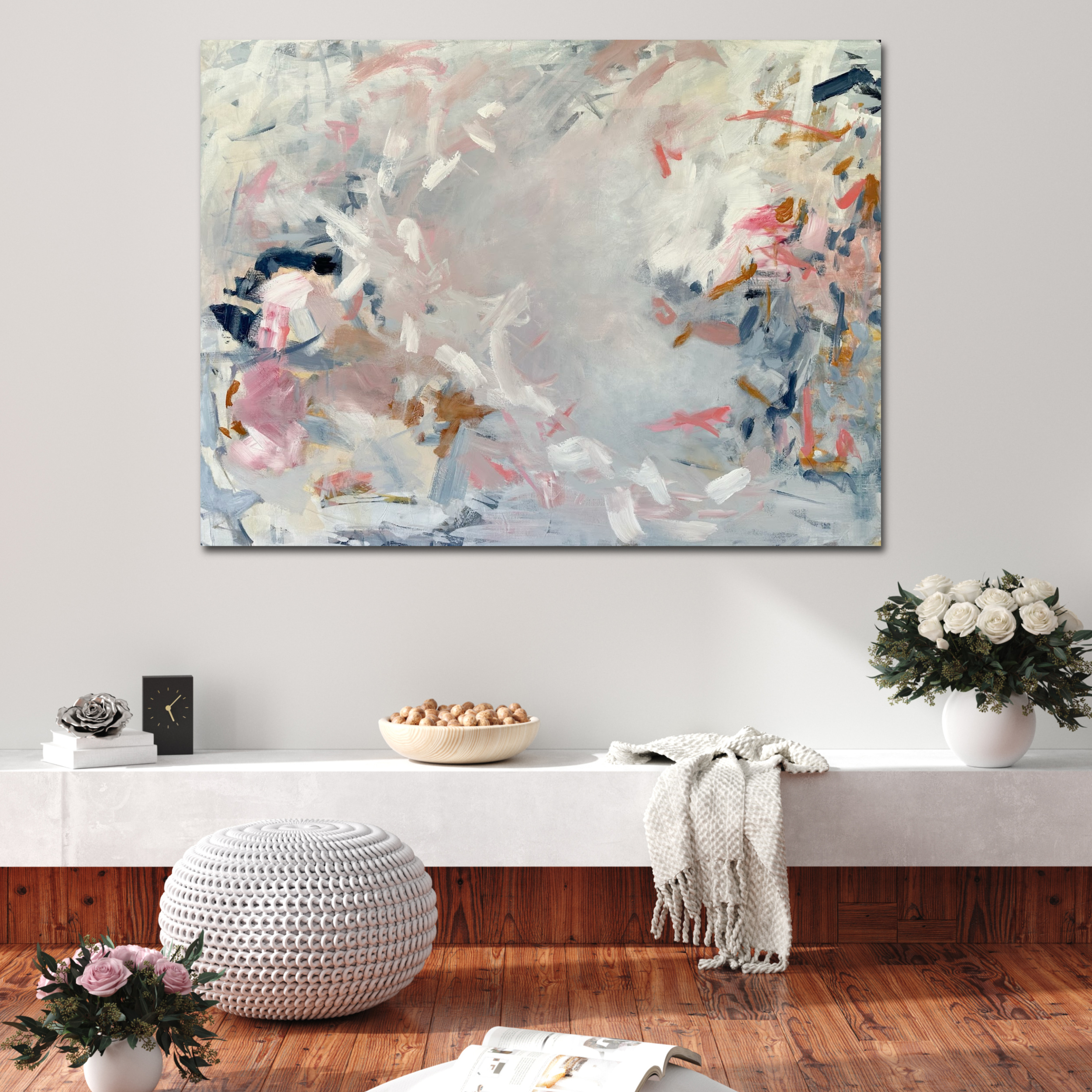 The Enchanting is a soft, abstract painting expressing calm and gentle movement in pinks, greys, blues and white.