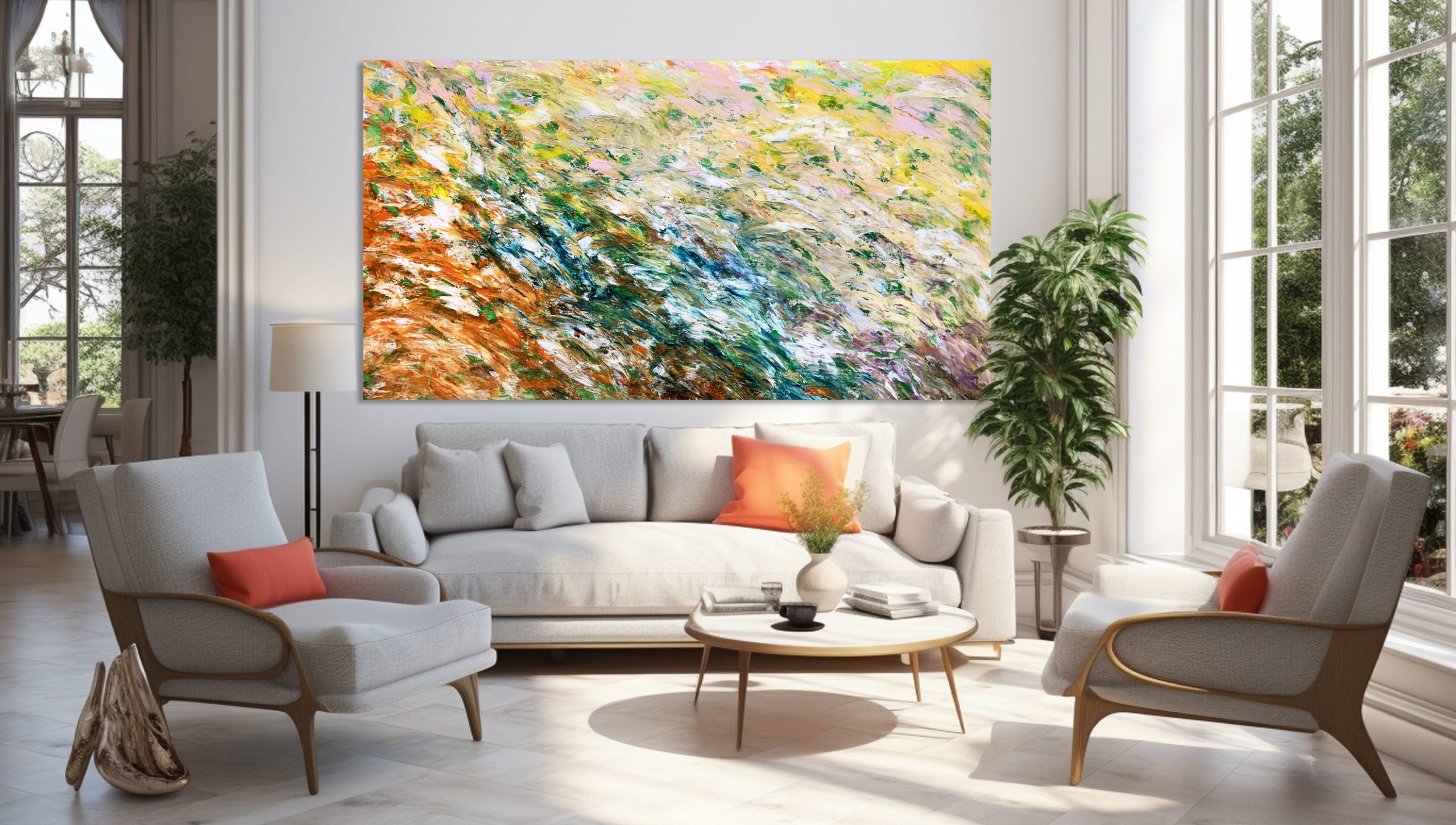 This work is painted with synthetic polymer acrylic and the surface is a professional-grade 12 oz canvas and has been sealed with varnish. The canvas is stretched onto an HD stretcher with dimensions 107cm in height and 198.1 cm in width. The painting is painted white on the sides so there is no need for framing.