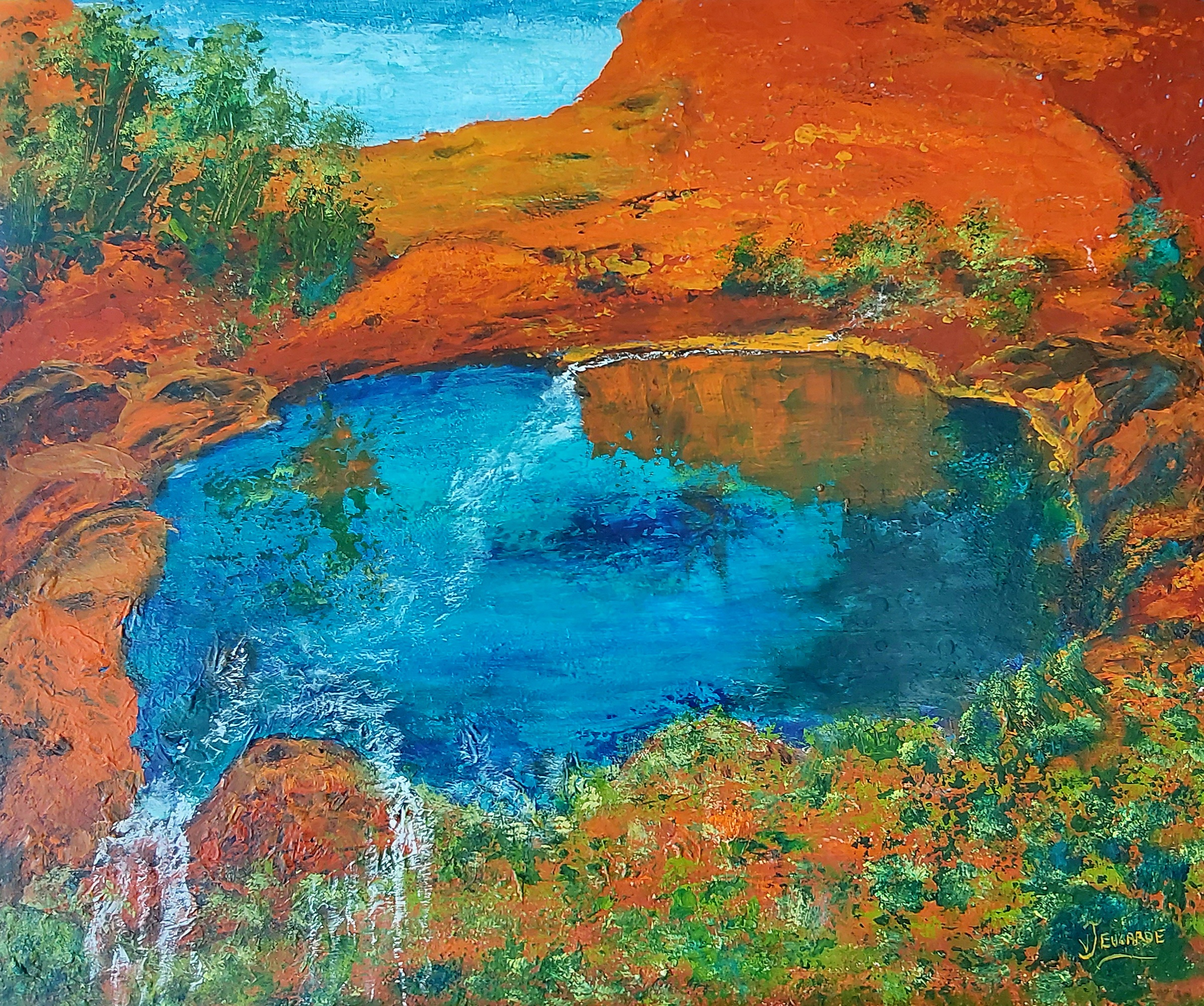 The Essence of Australia by Valerie Eugarde:- this painting was inspired by my love of the richness of this country and the places I long to travel to in my mind, it is a journey into the outback, completely intuitive and painted with many layers on a very textured canvas. Sides painted warm brown black.