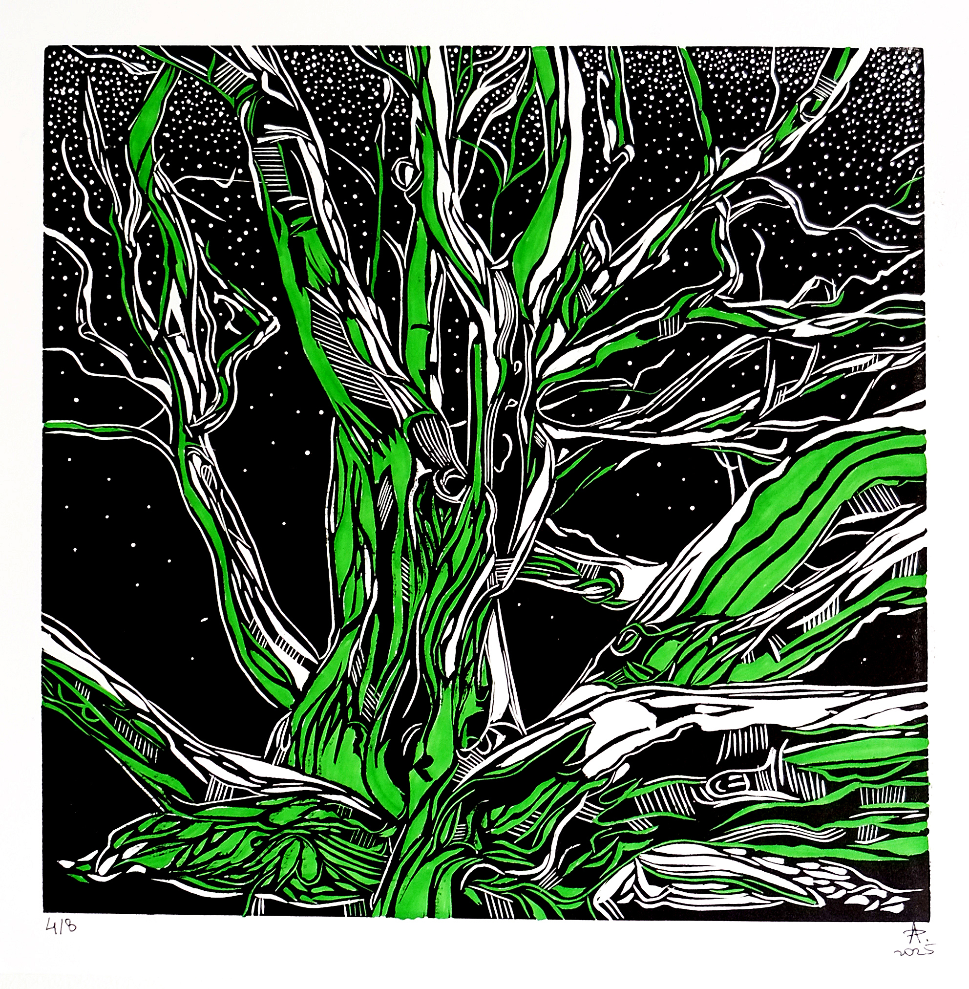 Inspired by the Avenue of Moreton Bay Figs at Fawkner Park, this linocut captures a night tree burning in yellow, carved line by line to reveal its secret inner glow.