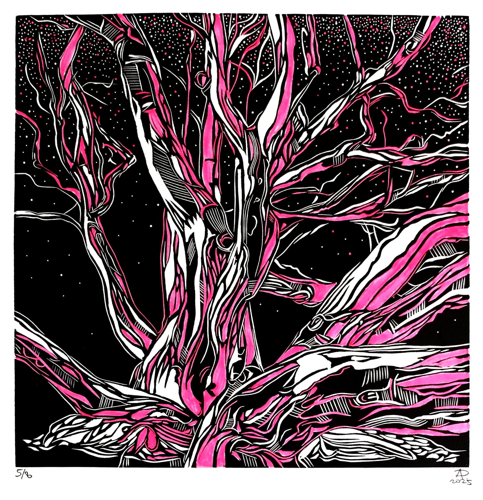 Inspired by the Avenue of Moreton Bay Figs at Fawkner Park, this linocut captures a night tree burning in yellow, carved line by line to reveal its secret inner glow.
