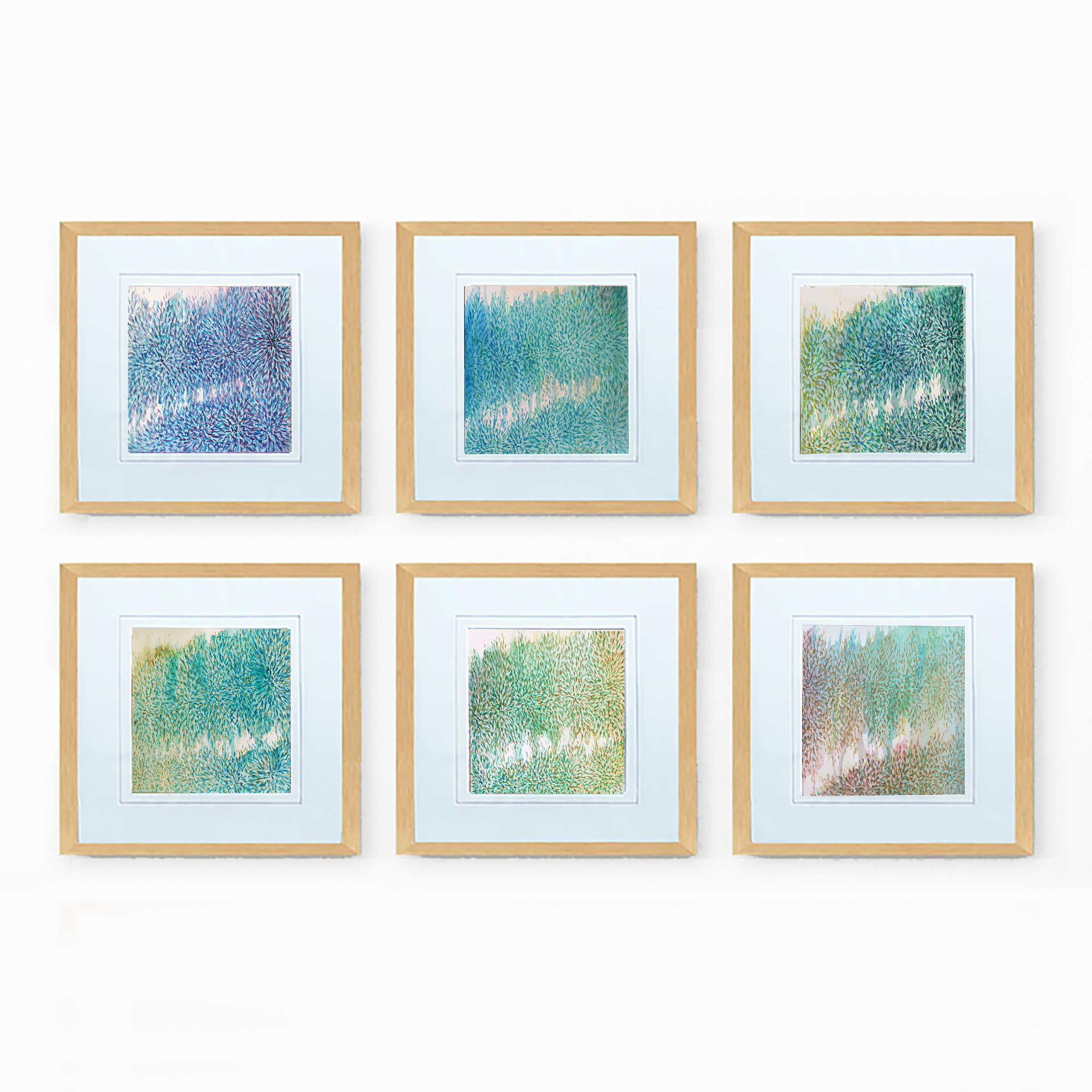 This blue colour abstract landscape set of artworks is from the series “Healing Landscapes”; a series of paintings which incorporate the patterned flow of growing leaf forms and blossoming petals with the healing power of colour to draw a connection with the emotional landscape . Sydney artist Leni Kae (dip colour therapy) applies colour science to this series.