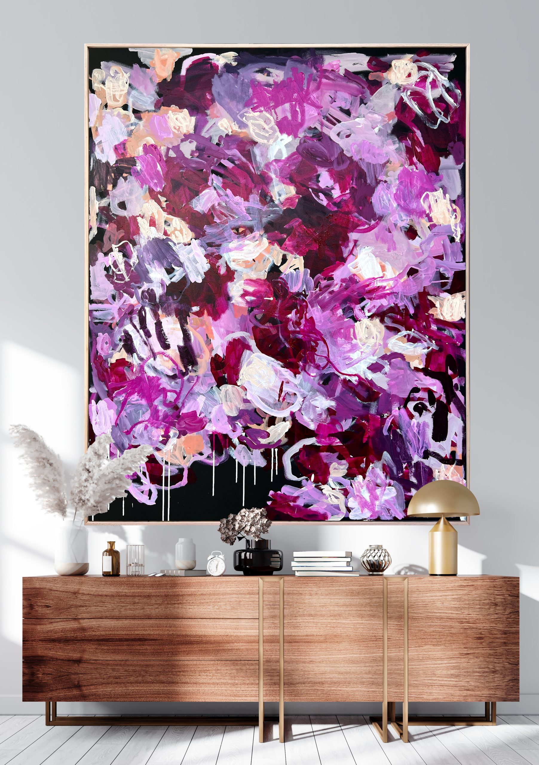 The Feeling At Midnight by Rebecca Koerting – Inspired by my childhood love and connection with the natural world – I paint secret worlds that I imagine – hidden worlds deep in the ocean and pockets of reefs may will never see. What I love most about abstract art, is that if someone sees something different to what I have intended – then that’s fantastic. I love it when collectors connect with a piece and see something different to me. It’s all about personal experience.