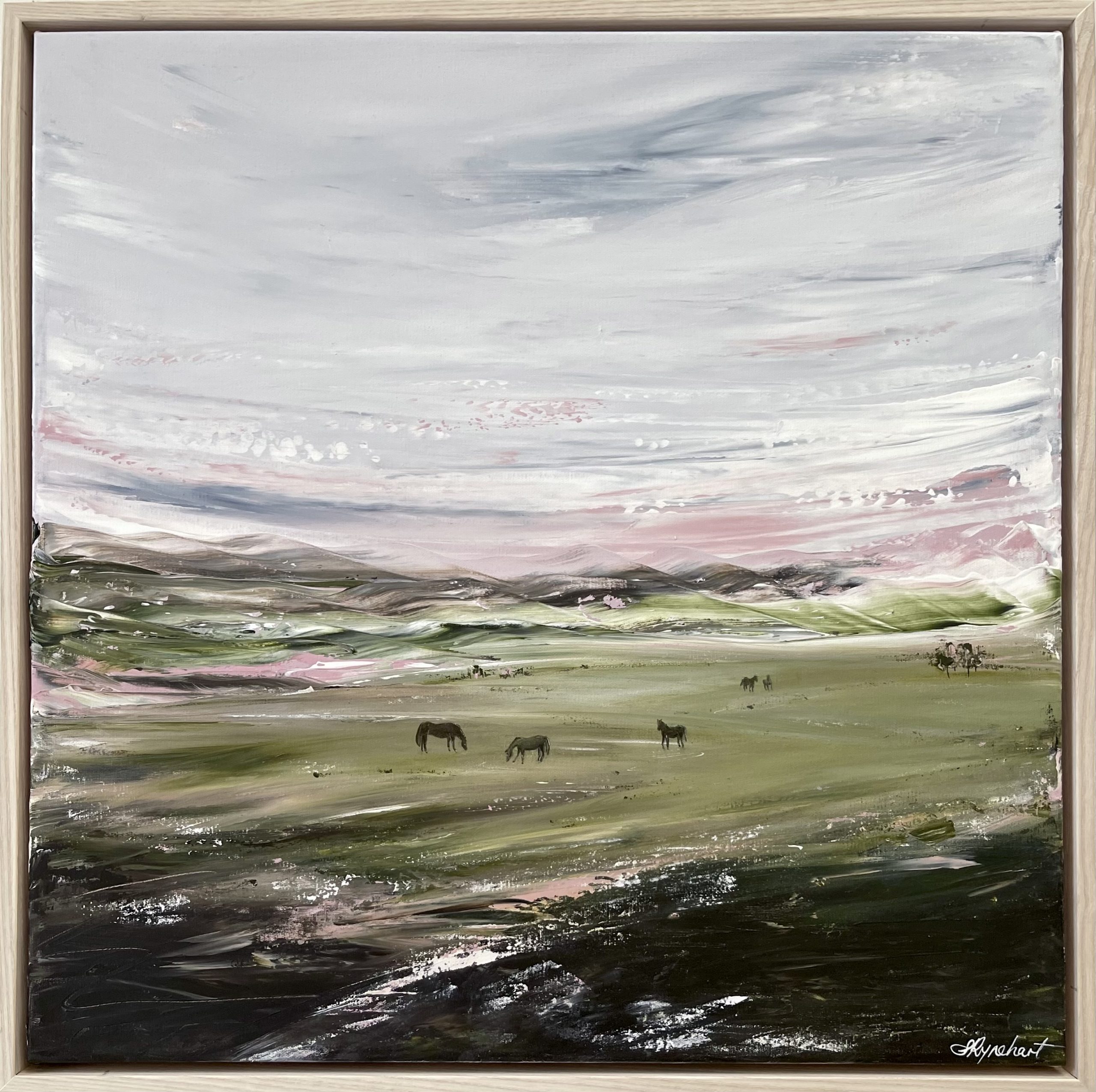 The first snowfalls of the season in the Snowy Mountains and Brindabella Ranges are something quite special. That time between scorched lands of Summer, and snow covered grounds in the midst of Winter, means that the land is still lush from Autumn rain. The wild brumbies that live in the ‘Snowies’ and ‘Brindies’ are frequently spotted in their mobs. In this late Autum/early Winter time it’s so pretty to see them grazing on lush green open fields with the ranges and fringes around them dotted with the first falls of snow. This palette knife artwork is inspired by those early first falls of Winter.