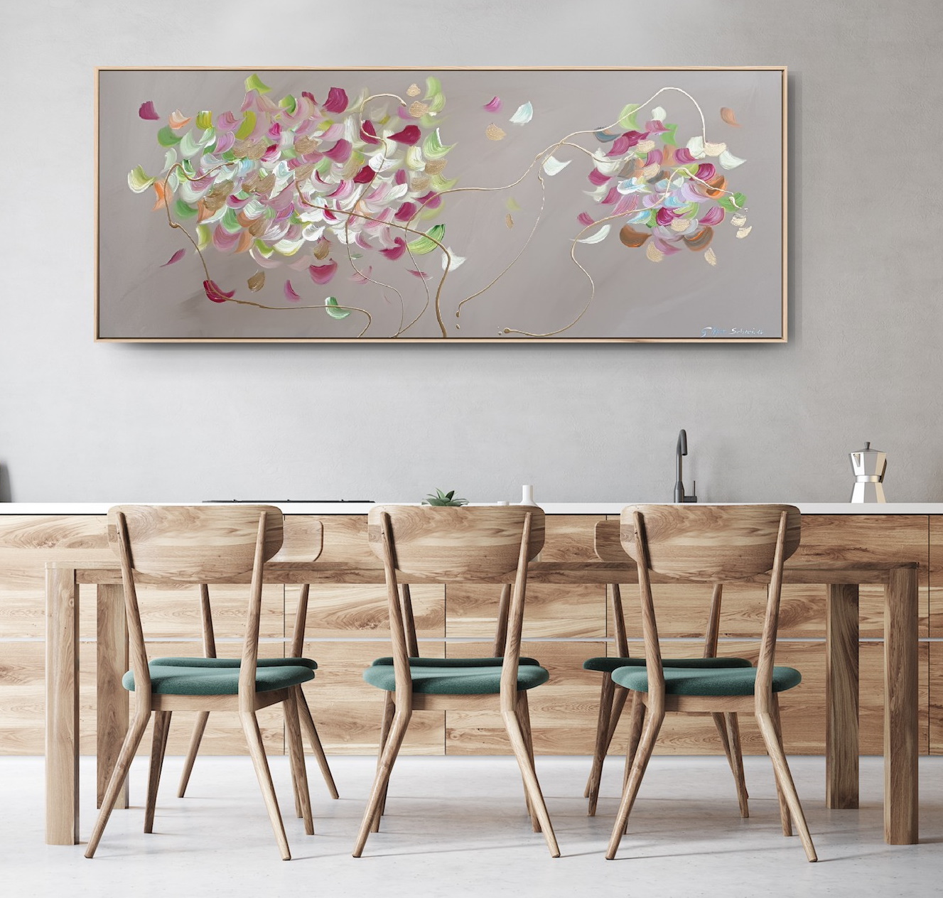 The painting doesn’t come with the external frame. The images attached are representations of what it could look like after being framed. No hanging wire.