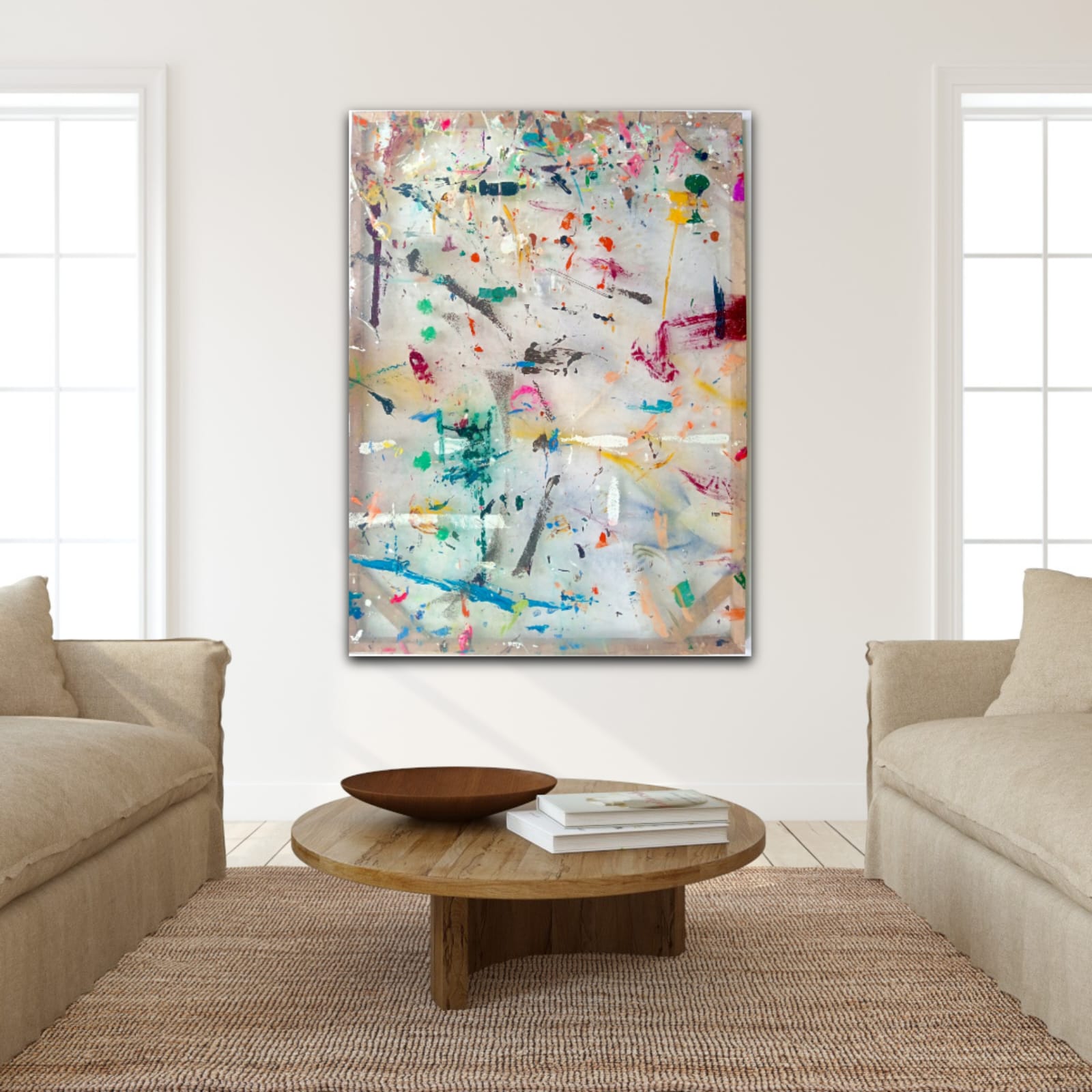 crafted over 10 months using innovative and sustainable methods. This piece is composed of vibrant paint applied to the inside of a durable PVC plastic sheet, backed with MDF wood for protection. The PVC is wrapped around a visible internal frame, 3 cm deep, enhancing its unique three-dimensional effect—making additional framing unnecessary.