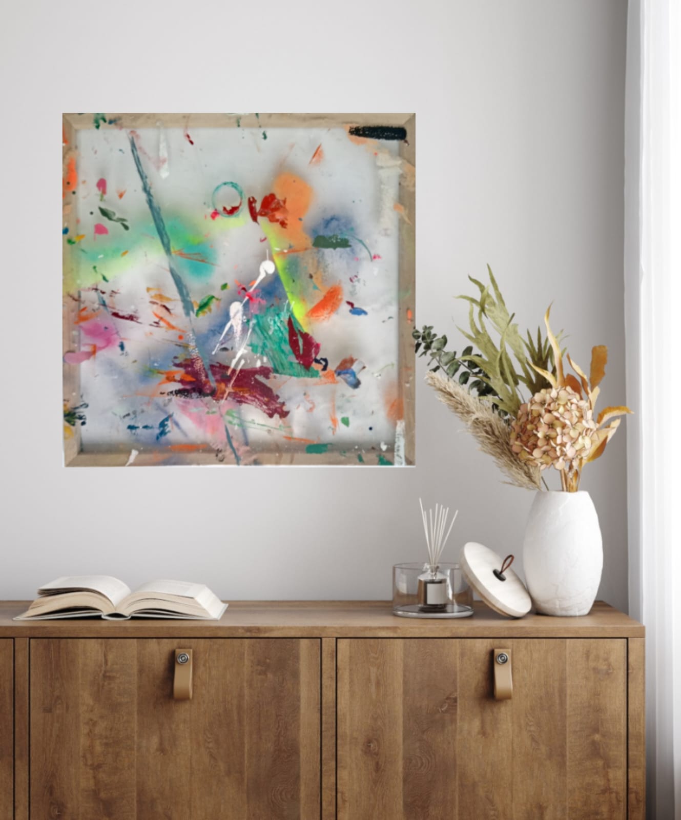 crafted over 10 months using innovative and sustainable methods. This piece is composed of vibrant paint applied to the inside of a durable PVC plastic sheet, backed with MDF wood for protection. The PVC is wrapped around a visible internal frame, 3 cm deep, enhancing its unique three-dimensional effect—making additional framing unnecessary.