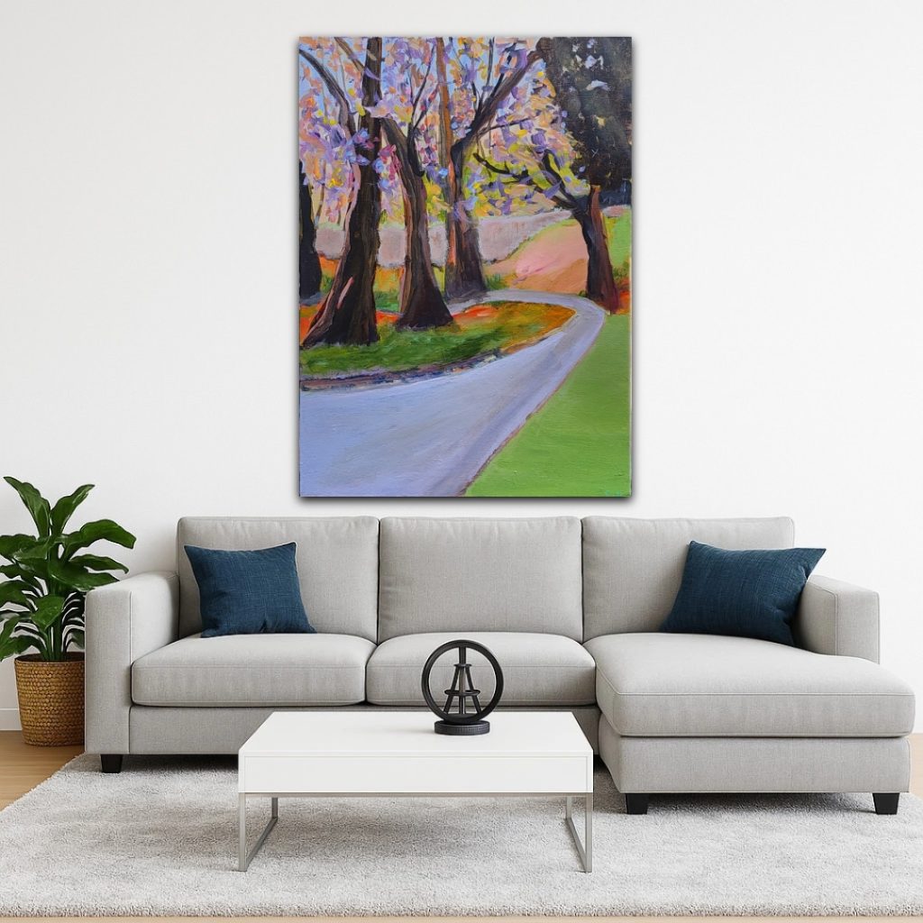 The Gentle Turn painting leads the viewer along a quiet, curving path where blossoms shimmer in hues of lilac, rose and gold. Soft sunlight filters through the petals, touching the earth with warmth and calm. The painting captures that fleeting hour when day leans towards dusk.