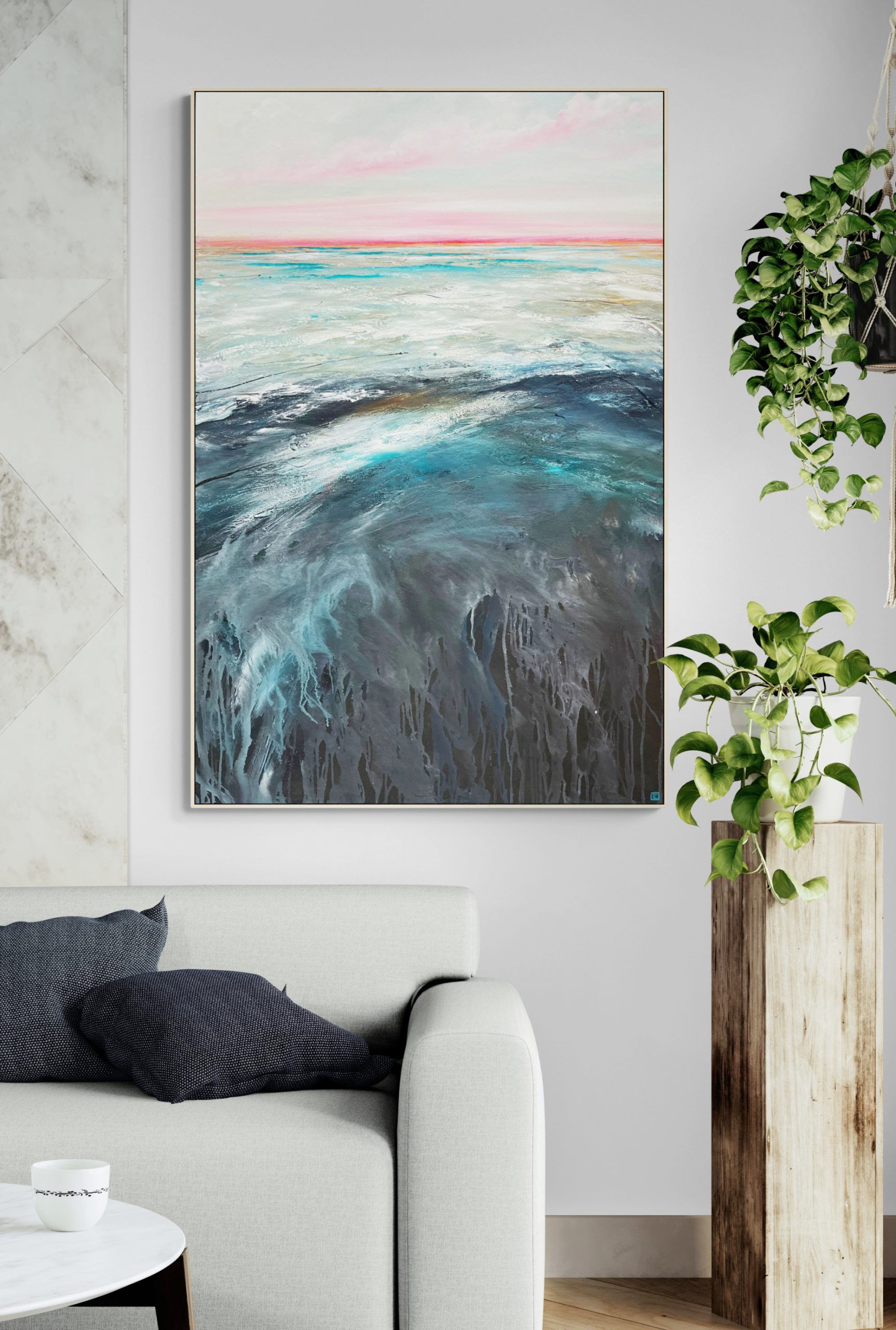 At the forefront of the composition, the sea roars to life with bold strokes of azure blue and turquoise, its surface alive with movement and energy. Layers of texture evoke the ebb and flow of the tide, while delicate washes of color create the illusion of light dancing upon the waves.