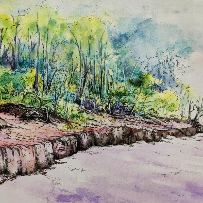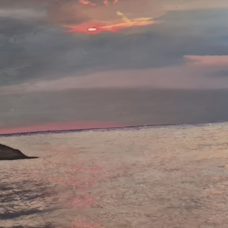 Oil, ink and Japanese rice paper on stretched canvas framed in rustic wooden frame painted purple