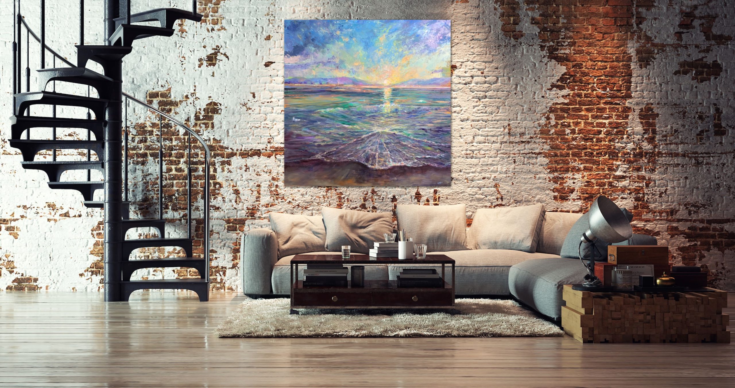 Painted from inspired walks at the beach, this work represents the huge energies unleashed by nature, at sunset. “The energy is most often tangible, inclusive of issues of life and death, changes, atmosphere and personal human journeys.” In honour of this energy, this art was created with dynamic, abstract, energetic strokes with a palette knife and brush, to allow the sense of flow in impasto. There is inherent, an exploration of joy and sorrow, and the beauty of being human as life invites change, new beginnings, and endings.