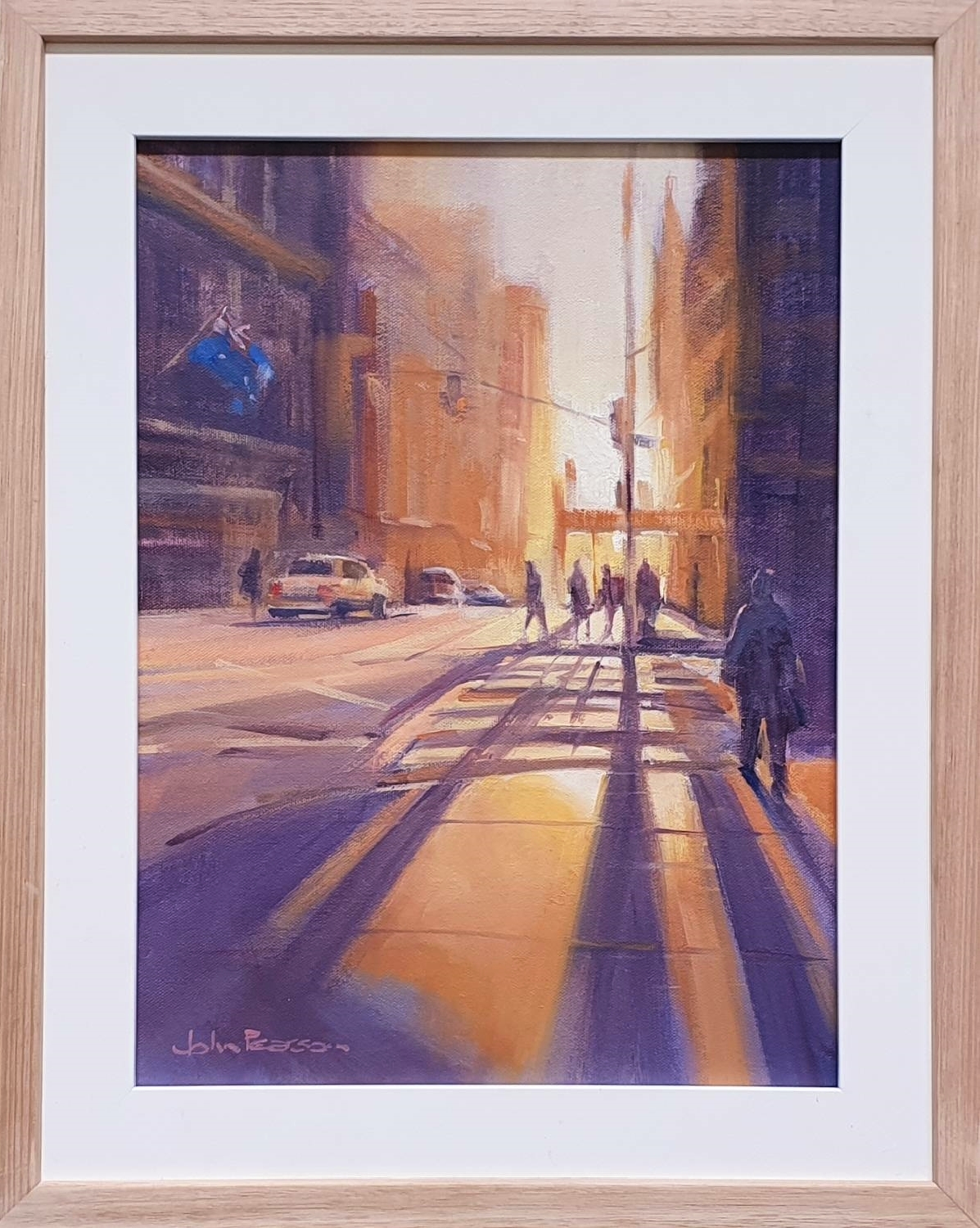 The Golden Hour by John Pearson – the city is bathed in a golden light in the late afternoon. Pedestrians hurry home before the sun sets.