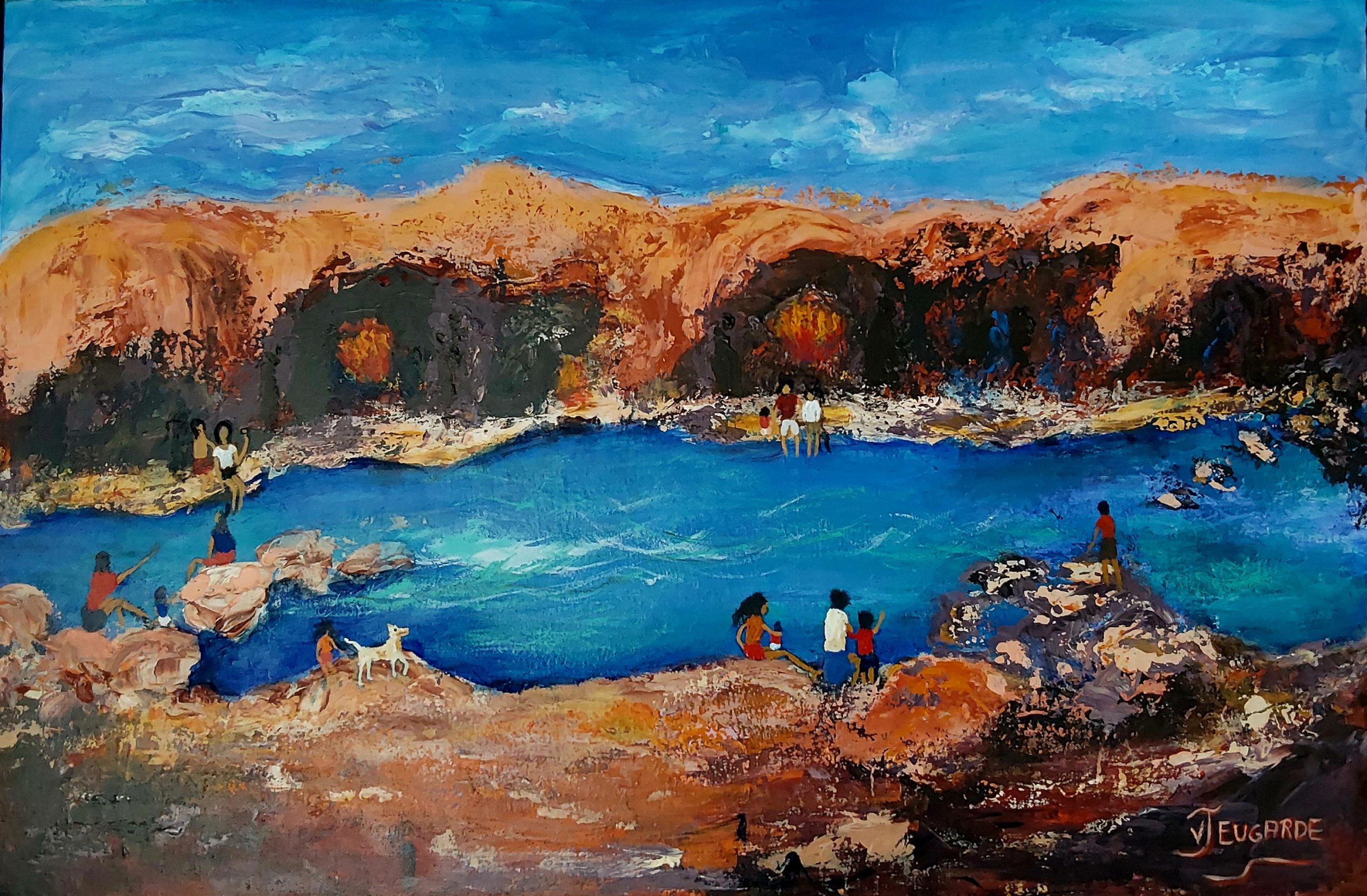 This is a bright happy naive painting of folk enjoying at day out at the local rock pools, it is done in a naive style with a palette knife technique.