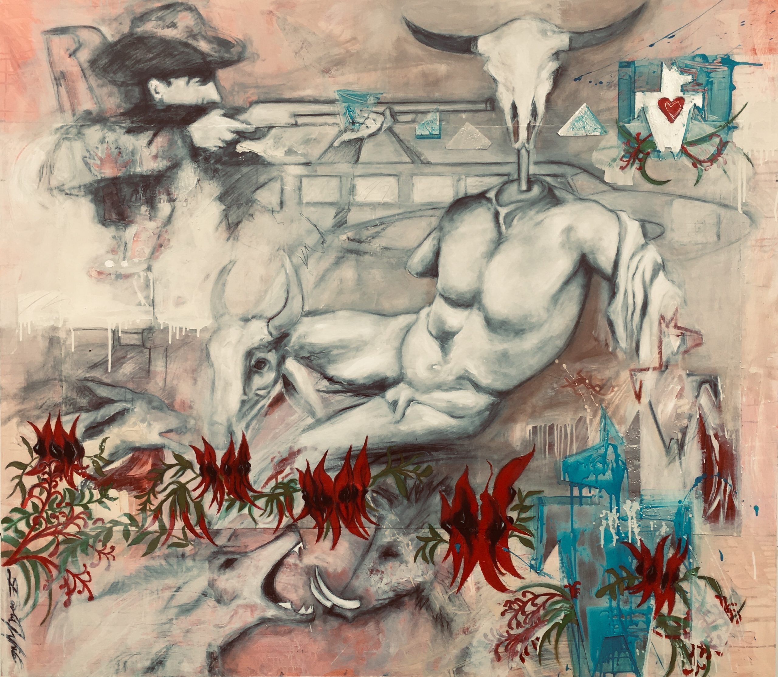 The Great Gay Elgin of the Outback – The title of this painting ‘The Great Gay Elgin of the Outback’ was inspired by a encounter and friendship with a transgender man back in the 50ties ..who was a woman. A “Hermorphodite’. We met in the South Australia in the notorious steel town of Whyalla. This place was a brutal hard working hard drinking working class town.