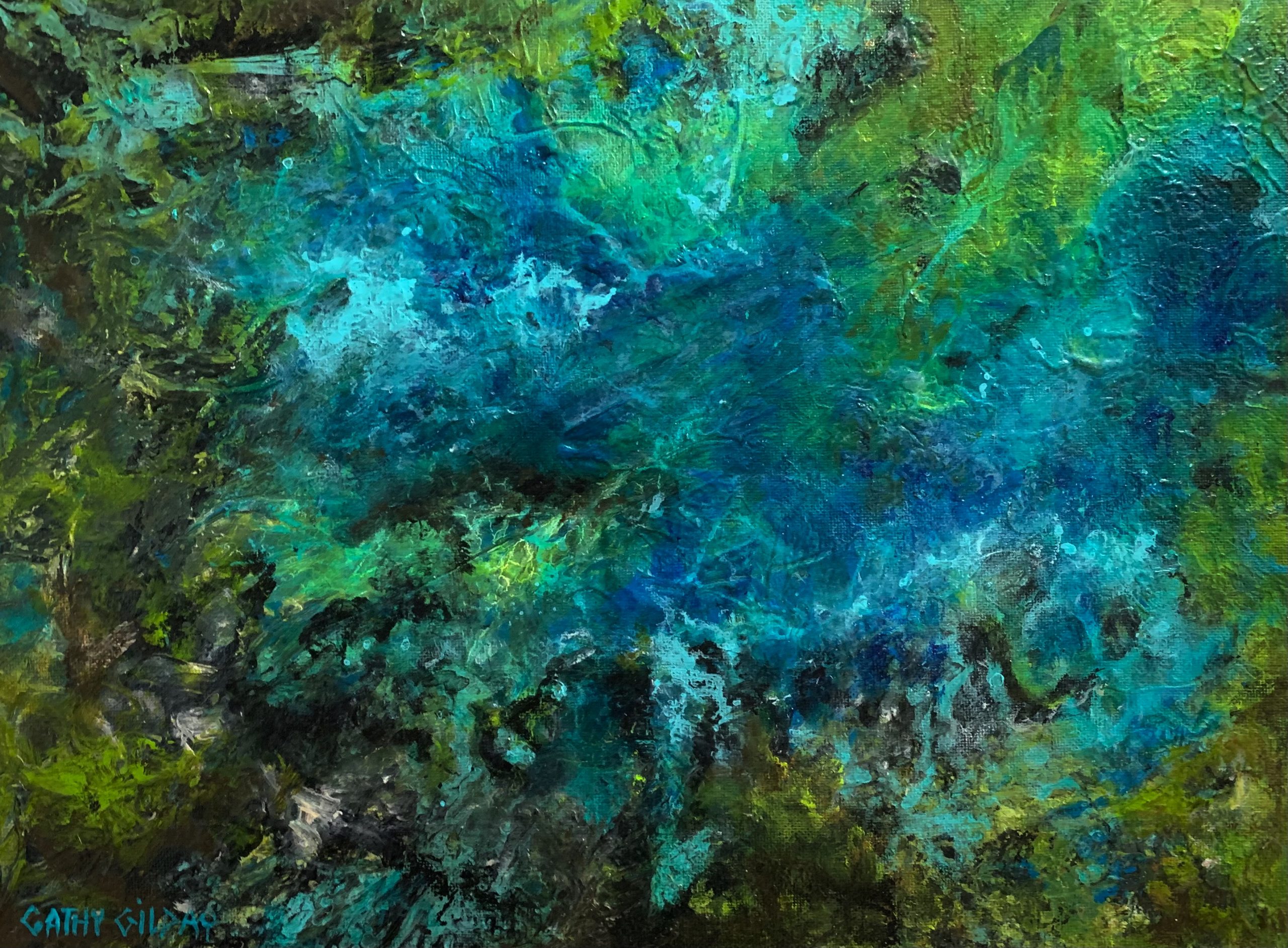 The Grotto by Cathy Gilday – A heavily textured abstract of a rocky blue grotto . Even when painting an abstract, I still find that nature is the best catalyst. Sides painted.
