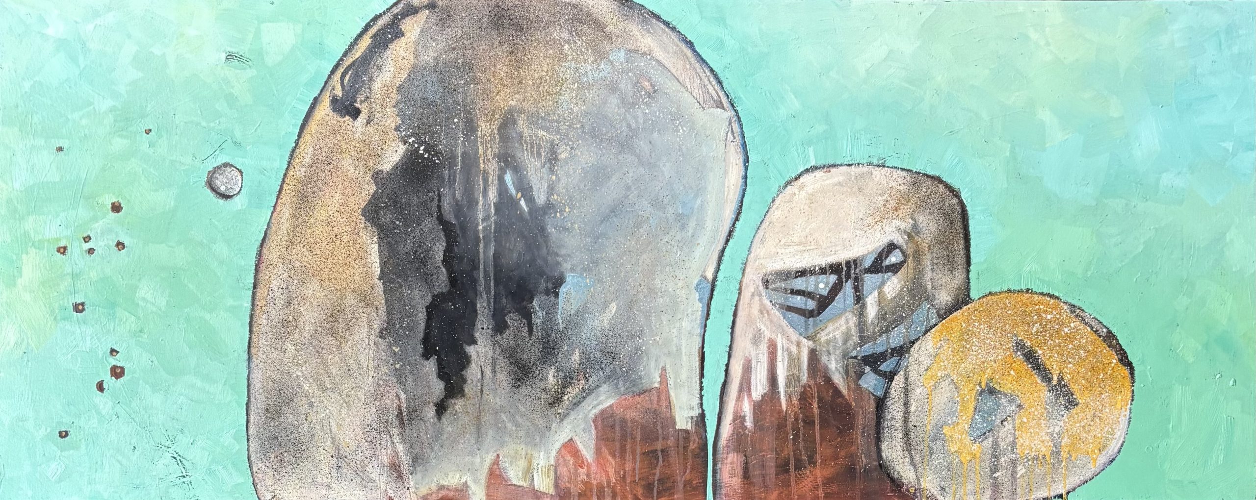 The Guardian. Original artwork by Erica Davis. Oil and acrylic on canvas. 61x152cm. Unframed/ready to hang. An abstract inspired by the beautiful rock formations of the Victorian granite belt. The work features the subtle luminous colours and speckles of granite set against an incandescent negative space. One of the rocks has a guardian spirit face watching over us.