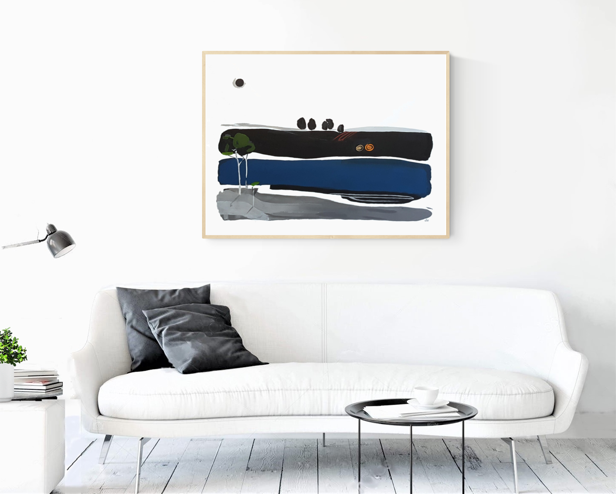 Inspired by the Australian Landscape, this original Acrylic captures the unique features of the Land in an abstract way to fit the modern interior design. Featuring Acrylic on Canvas, this piece will go with just about any interior design application whether at home or in the office. Predominant colour is black banding with white, grey and a dark blue. Splashes of orange, brown and green compliment the landscape providing a subtle pop against the black backdrop.Comes with a Certificate of Authenticity from Chris Cox.