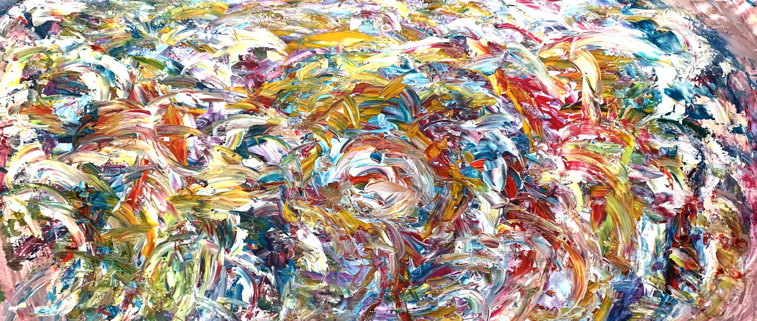 This artwork is painted on professional-grade canvas stretched and sealed with varnish. The canvas has dimensions 200 cm in width by 85 cm in height. The painting wraps around the sides of the stretcher, so the sides are painted in the same style as the surface. As such it does not need a frame.