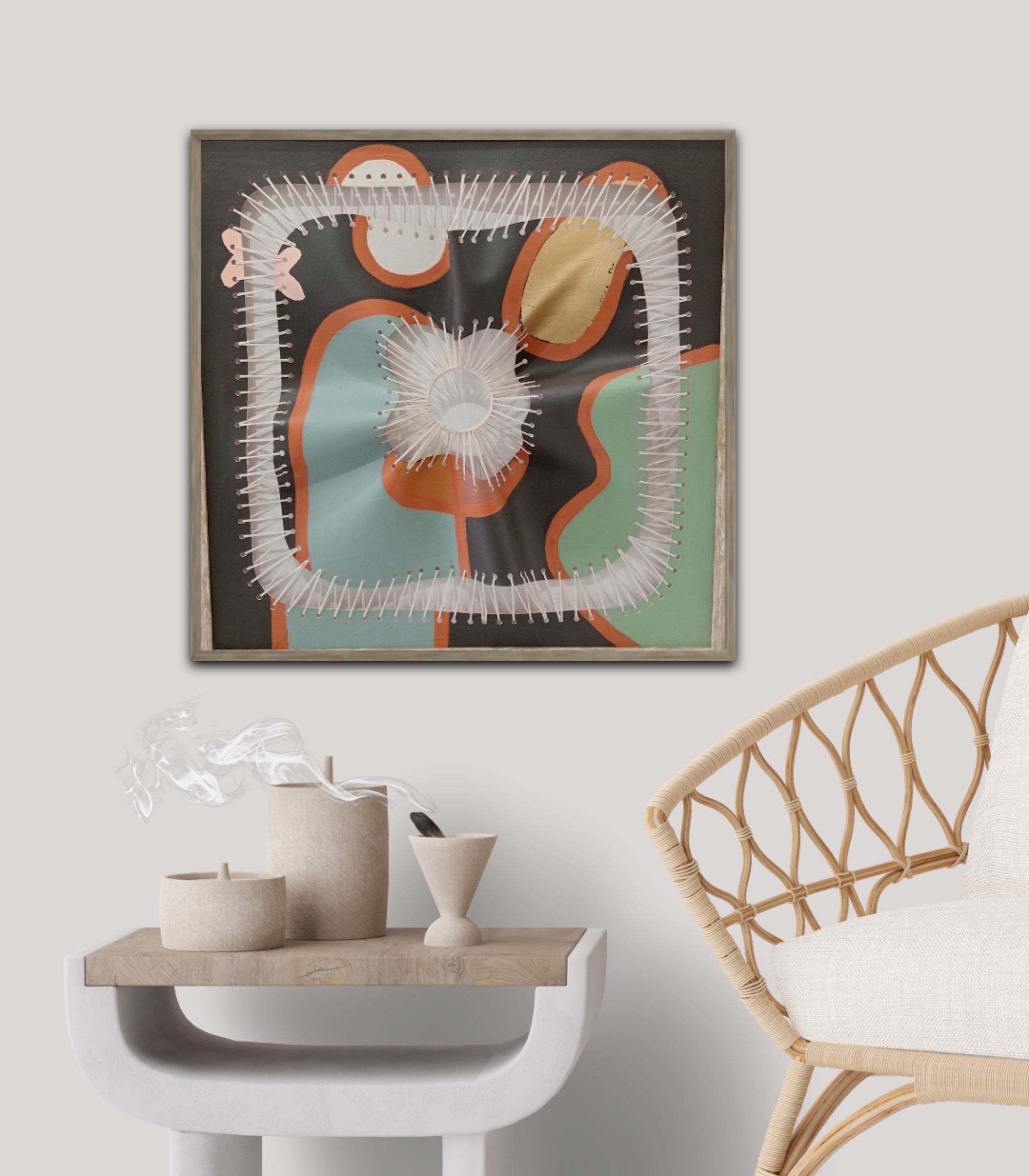 the canvas is transformed into dynamic, organic shapes that extend beyond a flat surface. This tension-based method results in textured, sculptural forms that emphasize resilience and reinvention, blending traditional art practices with innovative fabric manipulation. embodies the transformation of destruction into art, through innovative experimentation and boundary-pushing. This process highlights the beauty of rebuilding, celebrating resilience and the elegance of reconstructed imperfection.”