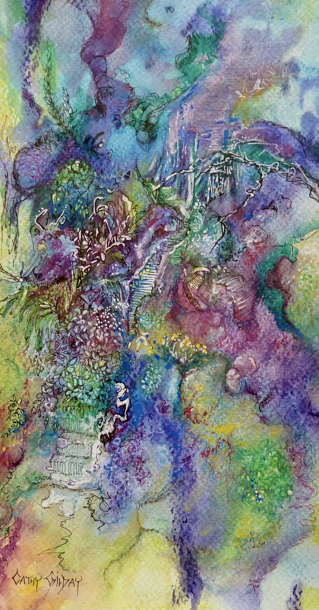 The Hideaway Cathy Gilday – Another of my mixed media fantasy landscapes. This one has lush green foliage‚ bathed in violet shadowy areas and meandering stairs leading to “The Hideaway .” Framed in a beautifully ornate gold frame, measuring W 22cm x H 33cm x D 2.5cm.