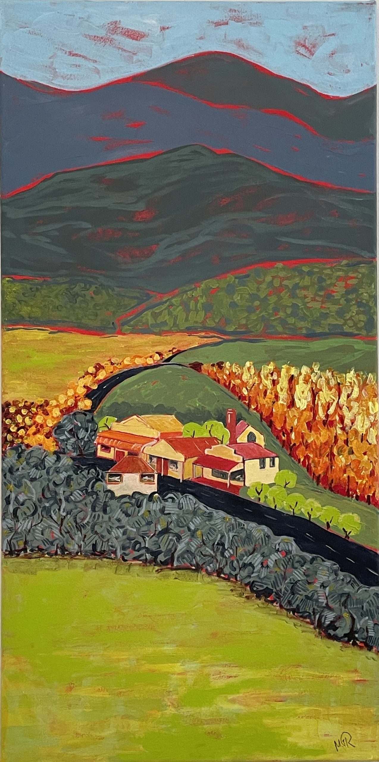 The High Country by Marie Riordan – A small village found amongst the rolling hills of the High Country. Heavy acrylic paint on a stretched canvas. Ready to hang.
