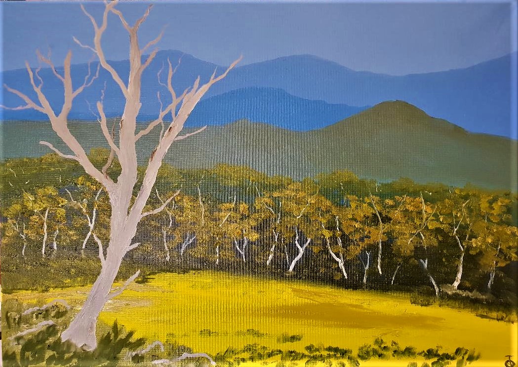 The High Country by Owen Jones – is located in the north-east of Victoria. It is an area that features national parks, Victoria’s highest mountains, lakes, snow resorts, vineyards and a rich history including gold discovery, cattlemen and bushrangers. This will be my last painting in oil. I am going to Acrylic as health reasons.