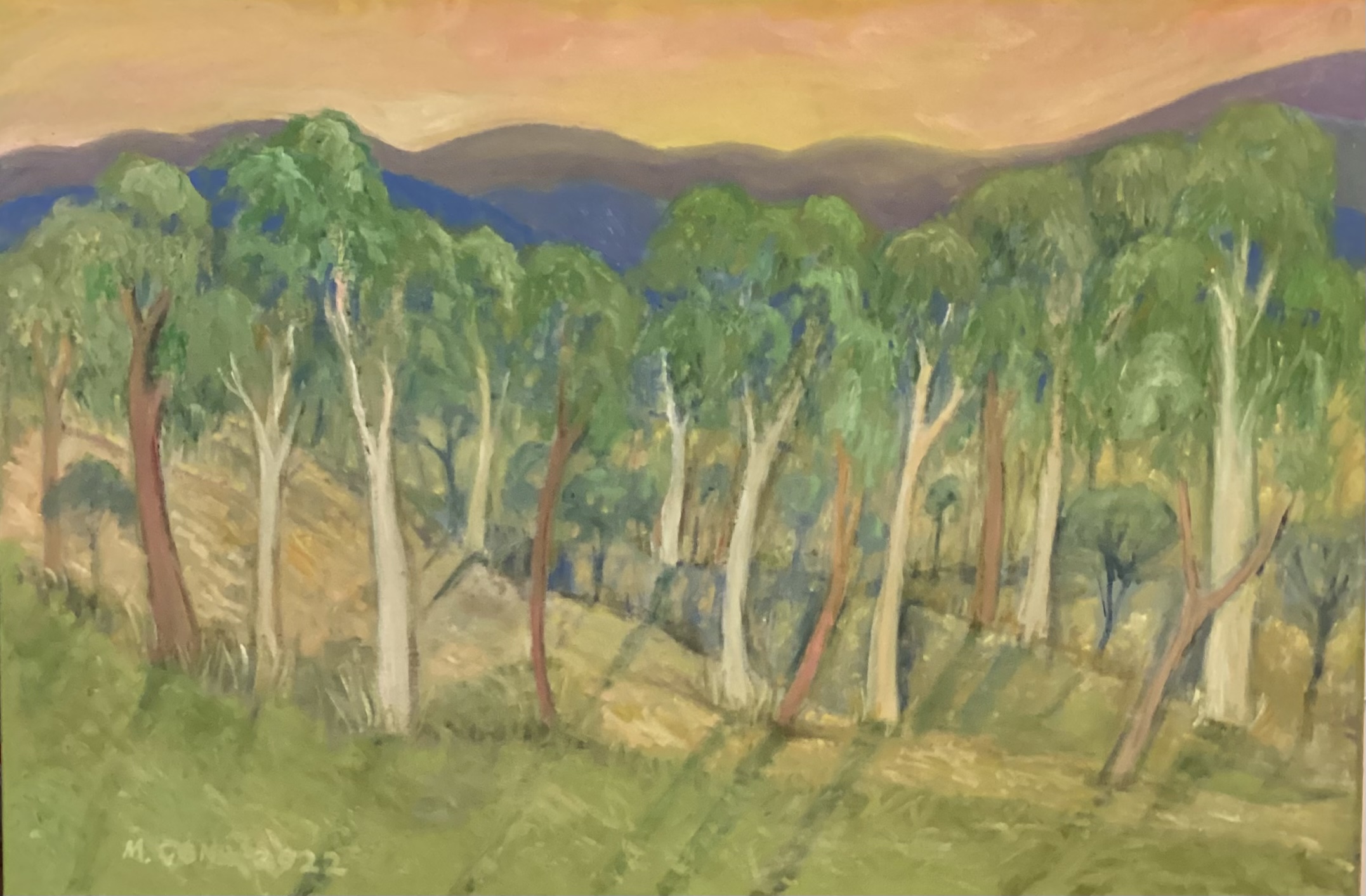 Quality oil paint has been used upon a professionally stretched and primed canvas.The painting is sealed and ready to hang . This image emanated from Margaret’s memories of being in the Adelaide Hills when growing up.The image is full of shadow and light reflecting the visual impact of the Australian bush land .