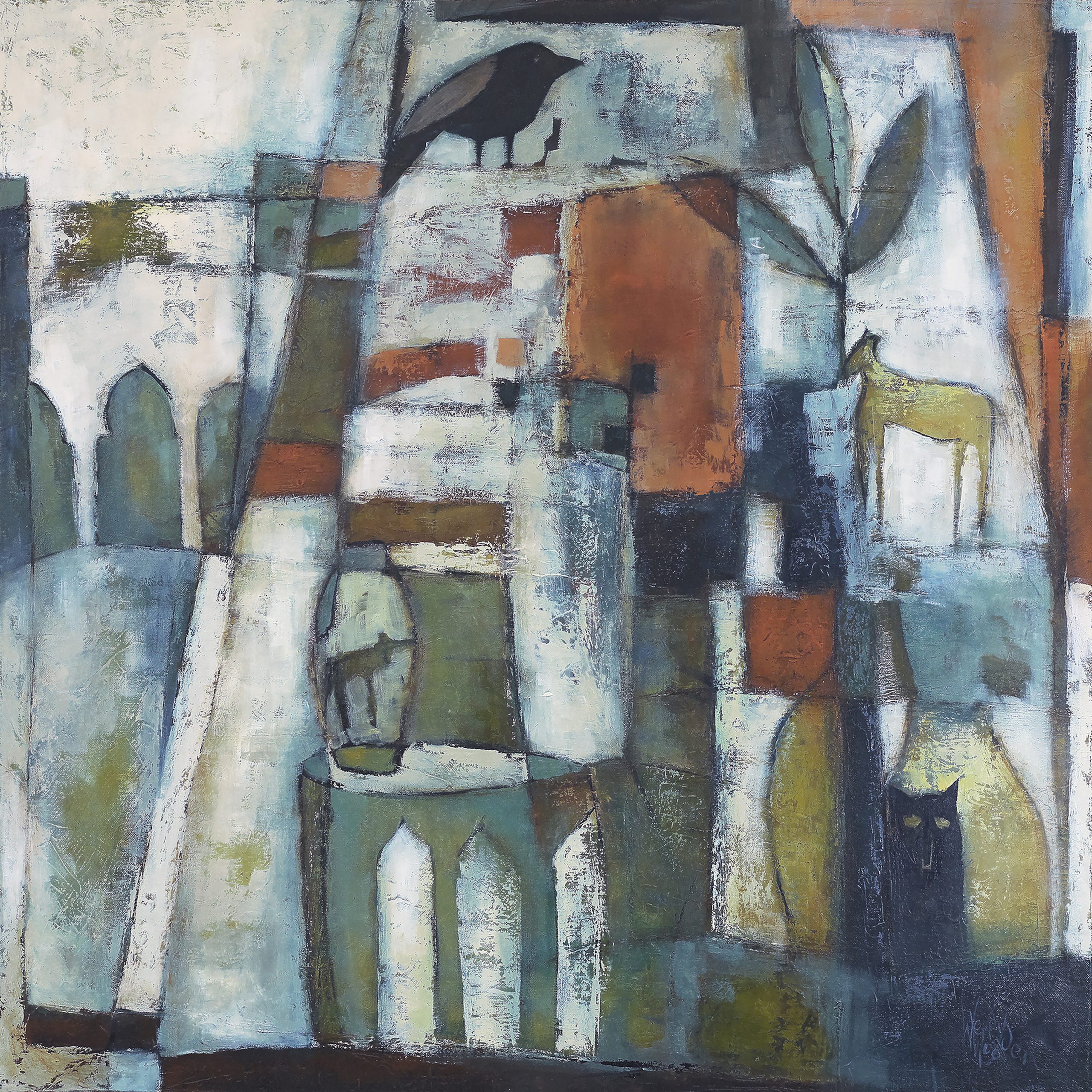 ‘Inspired by the villages of Morocco, this abstract piece weaves together fleeting moments of daily life into an abstract tapestry of colour, movement, and memory.’