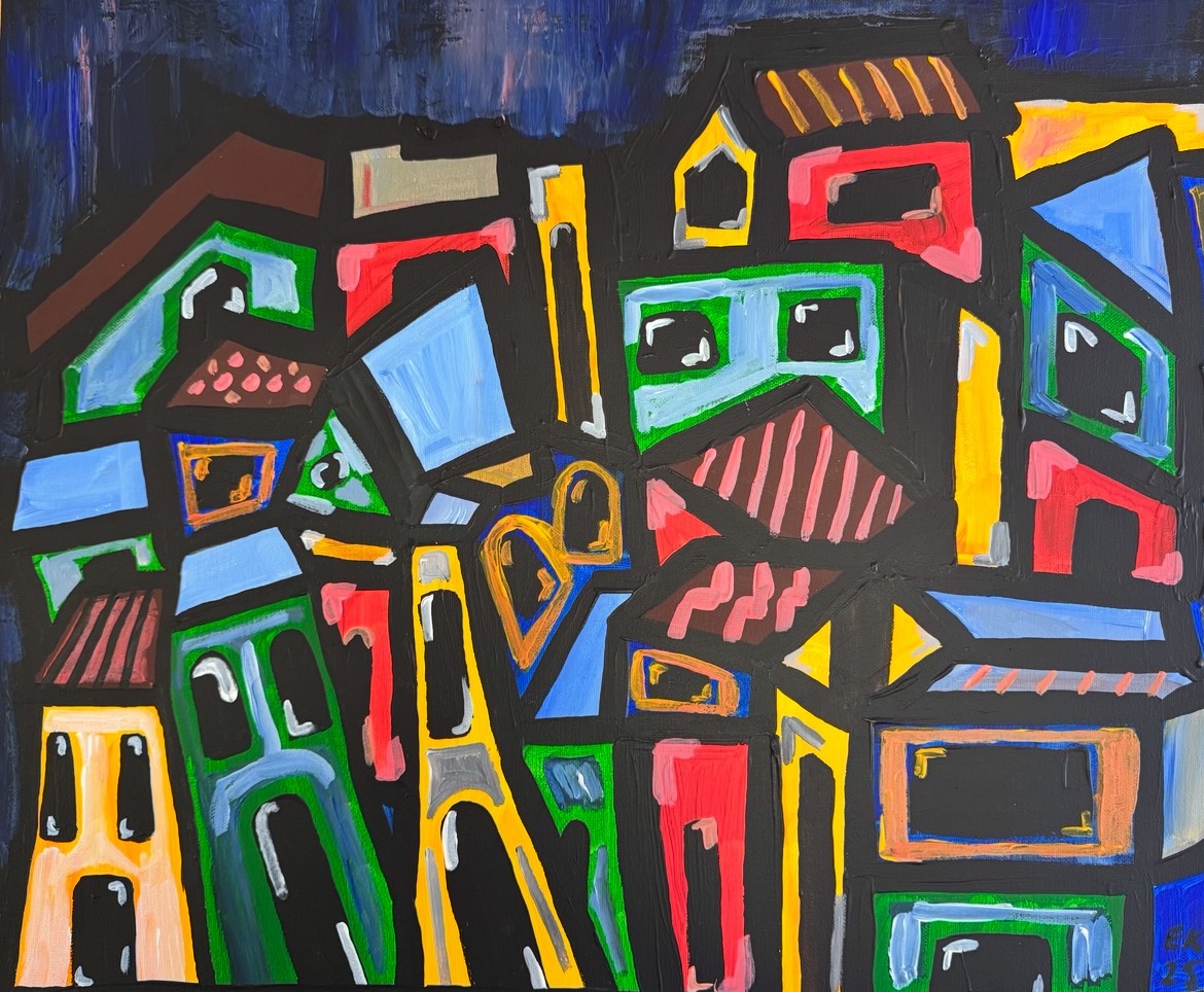 This artwork depicts many colorful houses close together with their own character and style. Houses in the painting represent the family unit which is incredibly important in our society. Overall, the painting represents the idea that although we are all different – we all work, fit and grow together as a whole