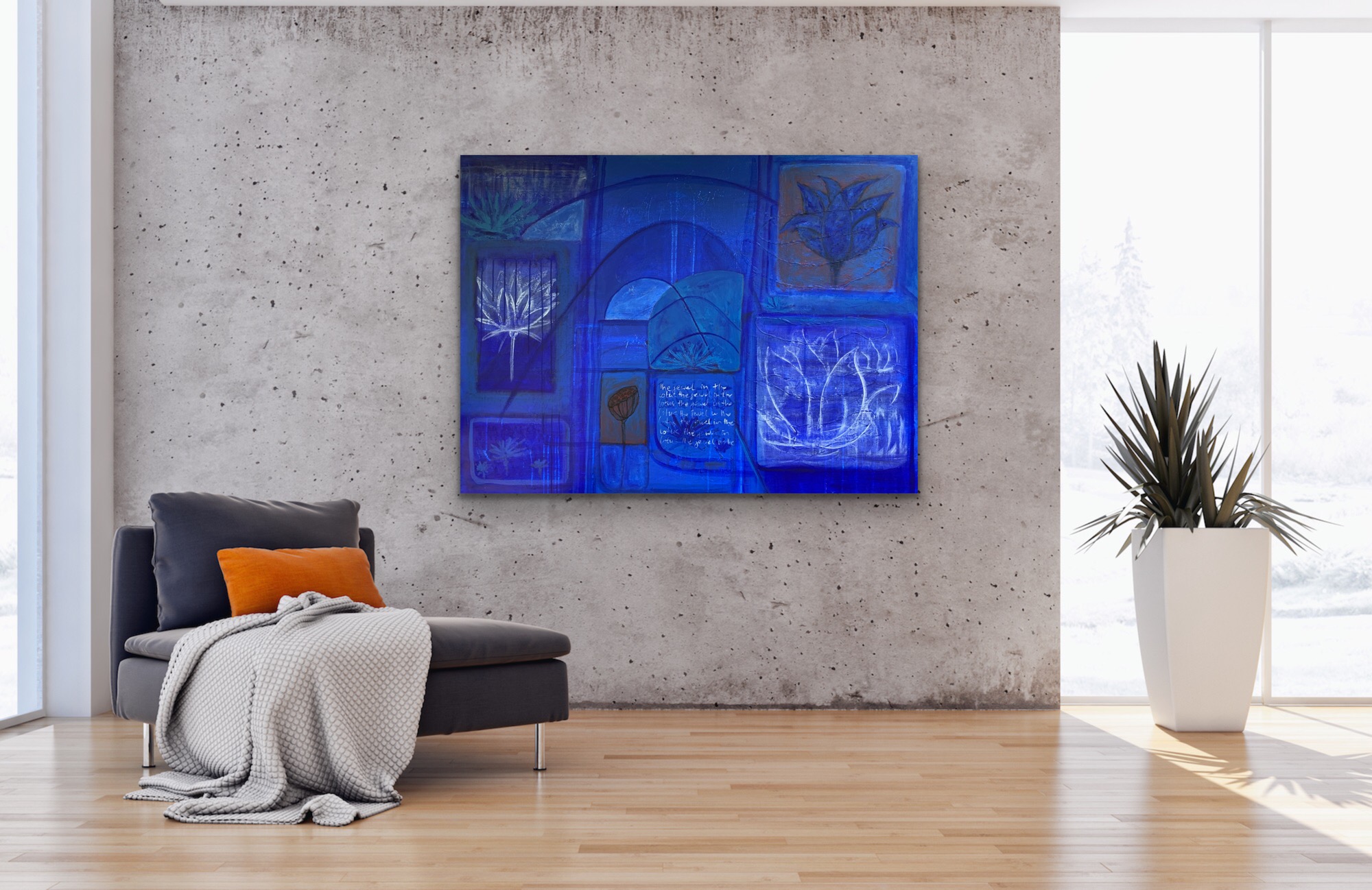 The jewel in the lotus by Marijke Lambregtse is a large artwork on stretched canvas inspired by her stay in Bali. Living in the ricefields and especially walking at night through the gorgeous paddies with the moonlight and coming past ponds with lotuses was kind of magic. The lotus is a symbol for many things! As the lotus rises from the muddy water without any stains they are often thought of as a symbol of purity and spiritual awakening and in Hinduism and Buddhism the expansion of the soul. Returning to the water each evening and opening their magic flowers at daybreak they are also symbols of strength and resilience. A metaphor for life! This painting is meaning to transport you to such a beautiful place at night when the flowers bobbing around beneath the murky waters.