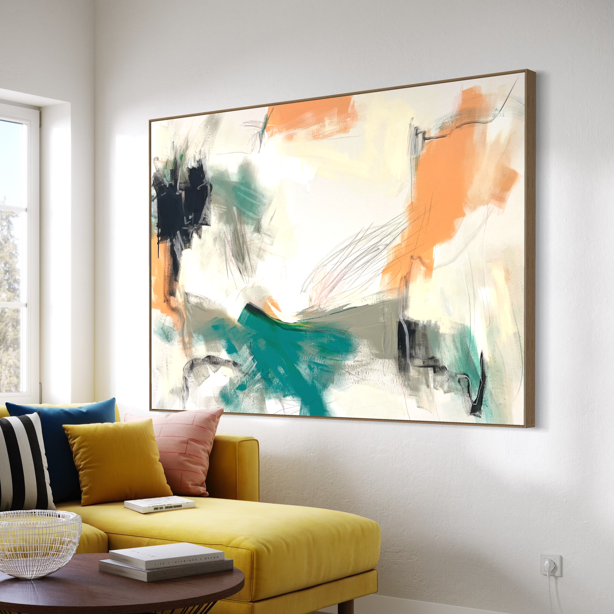 This large textured abstract has areas of bold and subtle gestural marks across the canvas surface. It’s striking palette consists of white, black, orange, coral, with a hint of lemon.