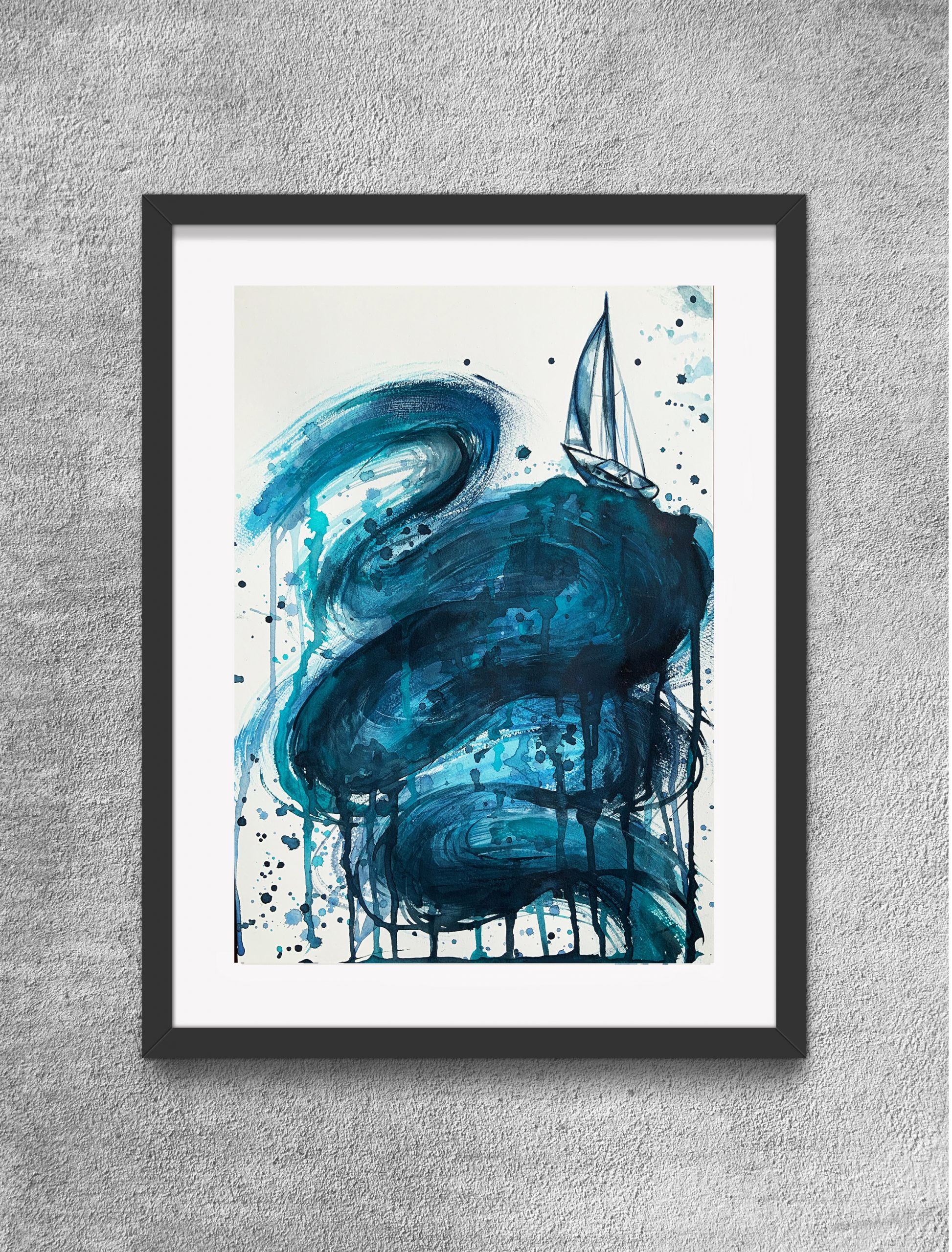 The Journey On by Leni Kae –Â A watercolour and acrylic seascape painting featuring large wave with a sailboat on top; carrying symbolism of a new journey and embracing the challenges ahead to succeed. A wonderful investment or gift for sailing fans and lovers of the ocean.