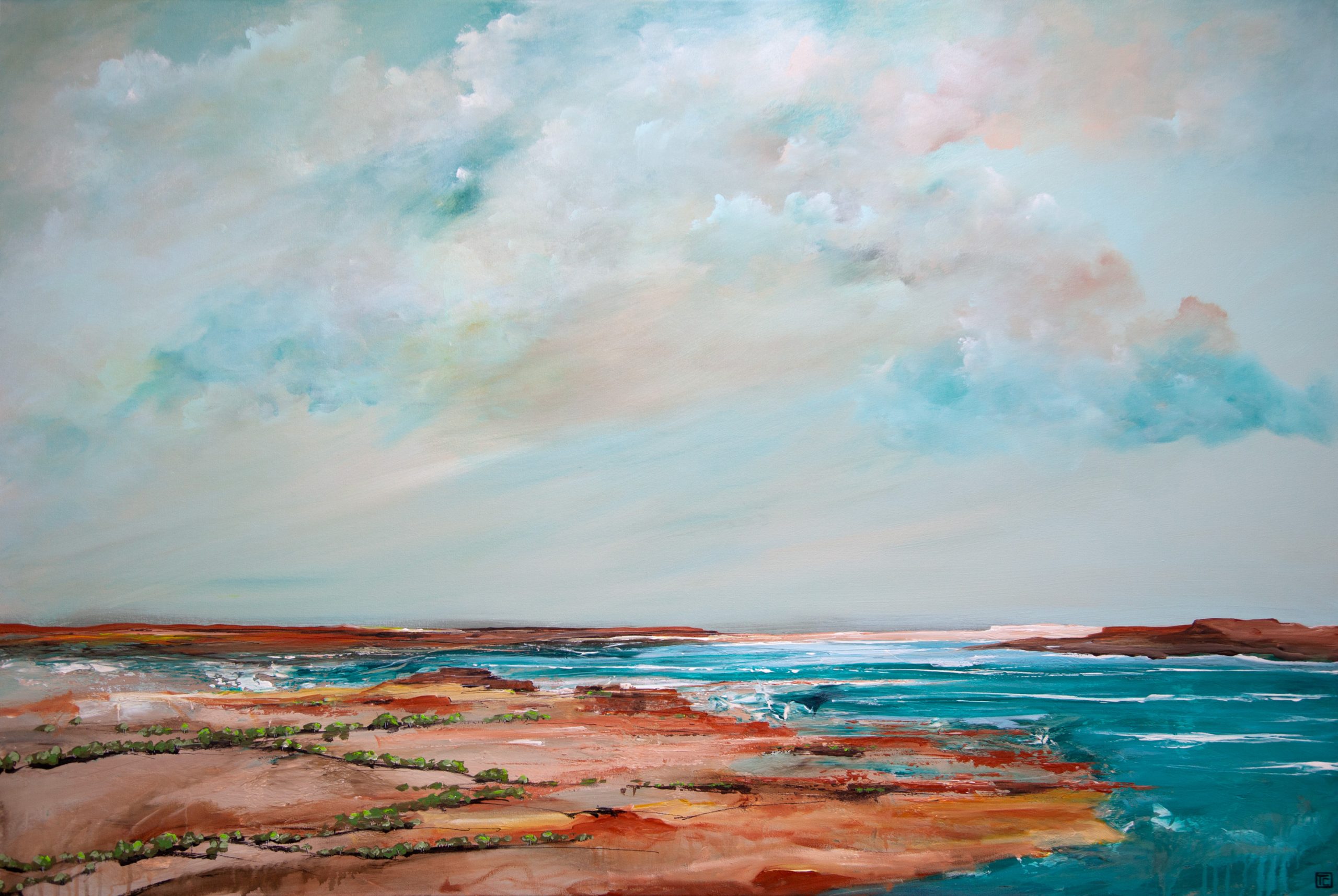 Tania Chanter is an Australian contemporary artist who has the desire to express emotion she feels from nature. Her feelings flow directly onto the canvas in an uninterrupted, intuitive flow; layers, textures and colours blend and evolve until some secret inner part feels satisfied. The depth and richness of the colours, the complexity of the sky – the romantic feeling of stormy clouds, the churning foam of the ocean on those days and the sunlight playing through tall grasses as they bend and wave. From the sweep of the vast landscape down to the bee among flowers, natures inspiration is endless.